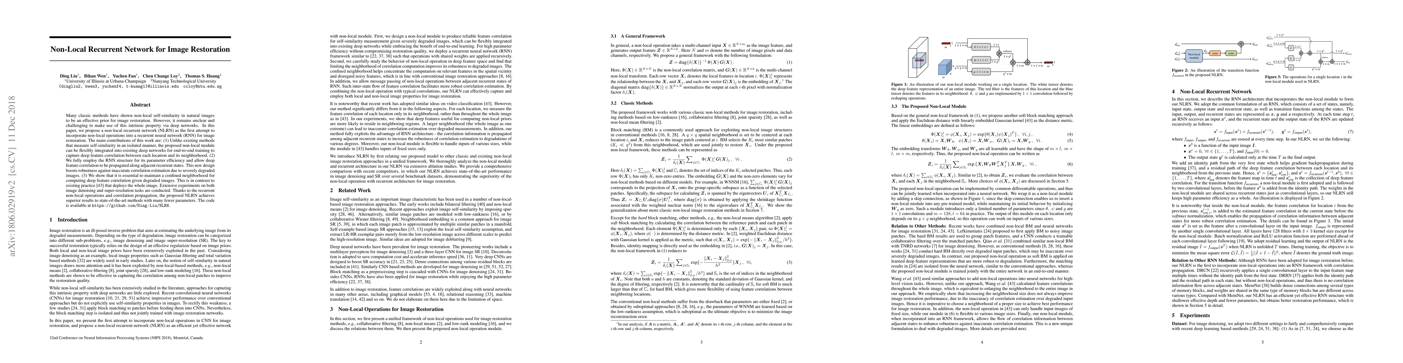A new neural network architecture called Non-Local Recurrent Network (NLRN) achieves better image restoration results than existing methods with fewer parameters, using a combination of recurrent operations and correlation propagation.