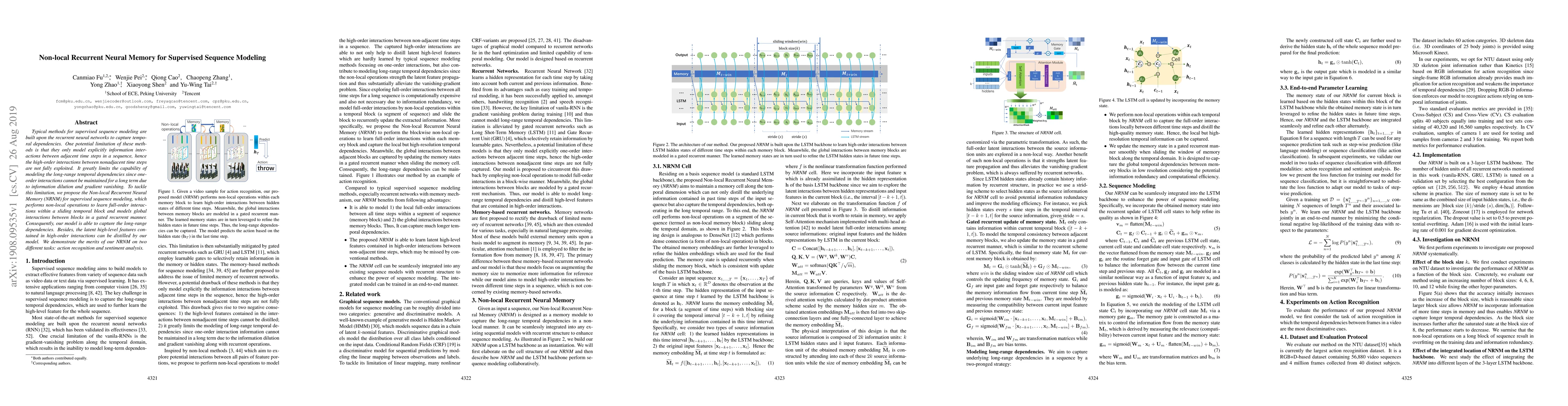 The paper proposes the Non-local Recurrent Neural Memory (NRNM) to capture long-range temporal dependencies in supervised sequence modeling, overcoming the limitations of traditional RNNs that only model interactions between adjacent time steps. NRNM employs non-local operations and gated recurrent mechanisms to model global interactions, demonstrating improved performance in action recognition and sentiment analysis.
