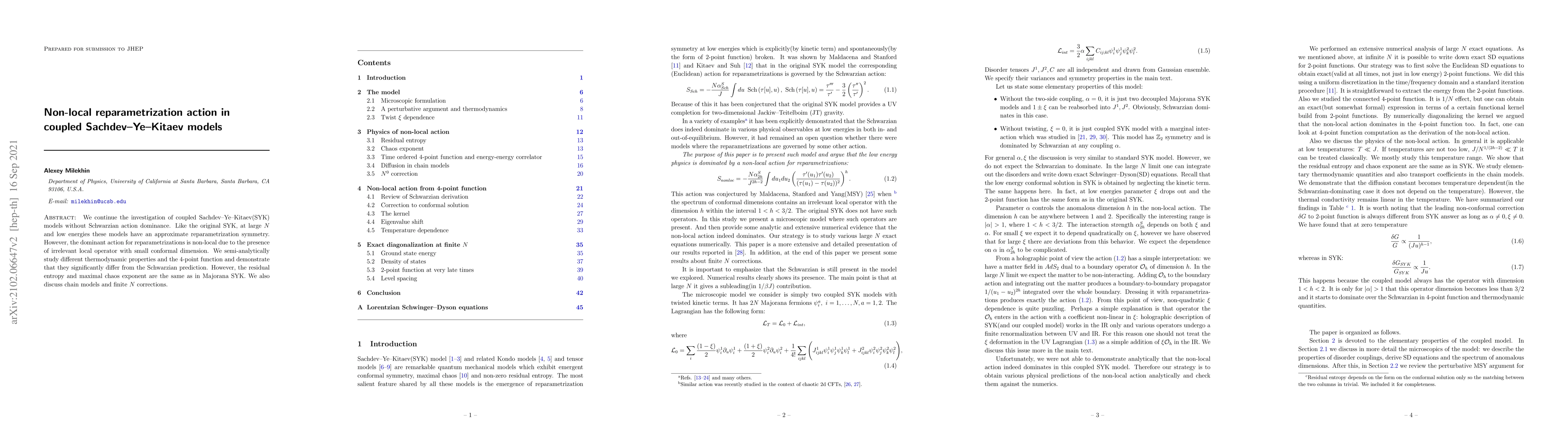 Summary: This paper investigates coupled Sachdev-Ye-Kitaev (SYK) models without Schwarzian action dominance, revealing a non-local reparametrization action that significantly alters thermodynamic properties and the 4-point function compared to Schwarzian predictions, while maintaining the same residual entropy and maximal chaos exponent as Majorana SYK.