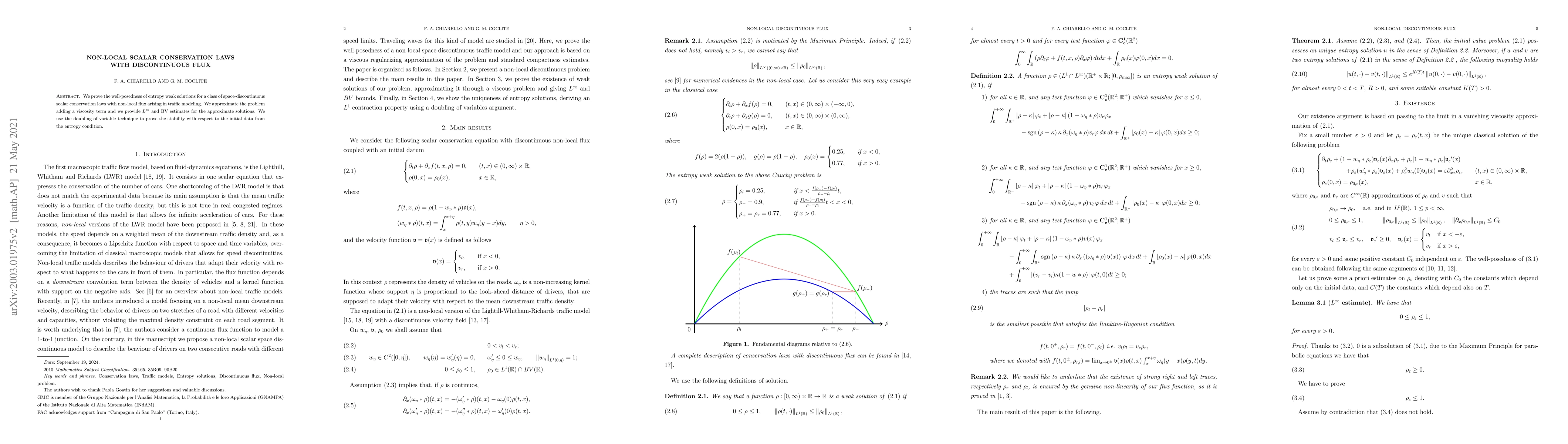 This paper establishes the existence and stability of entropy weak solutions for non-local scalar conservation laws with discontinuous flux, using a viscosity approximation and the doubling of variable technique. It provides $L^\infty$ and BV estimates for the approximate solutions.