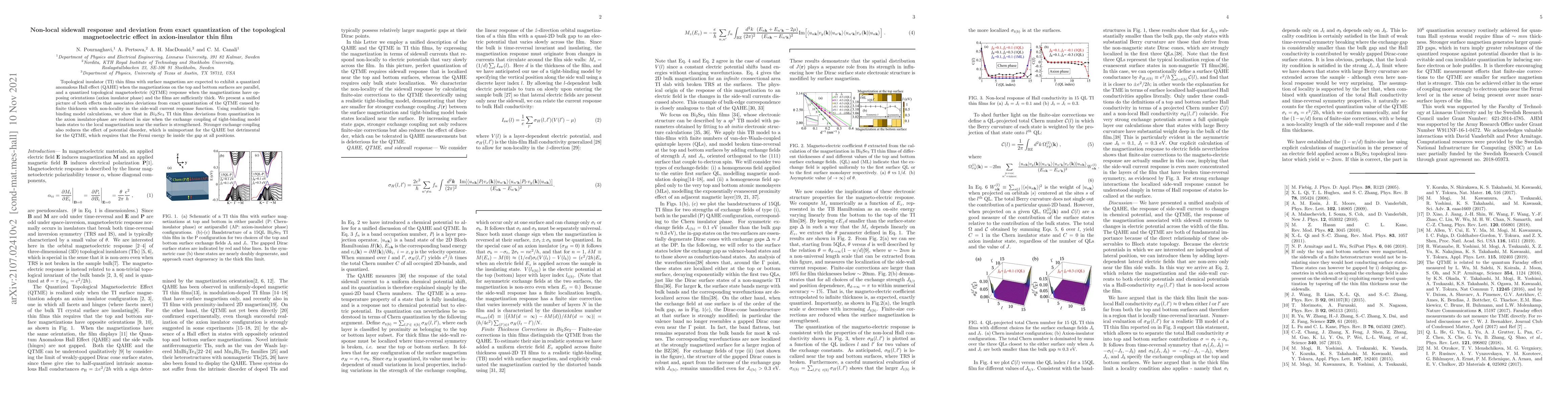 Topological insulator (TI) thin films with surface magnetism are expected to exhibit a quantized anomalous Hall effect (QAHE) when the magnetizations on the top and bottom surfaces are parallel, and a quantized topological magnetoelectric (QTME) response when the magnetizations have opposing orientations (axion insulator phase) and the films are sufficiently thick. We present a unified picture of both effects that associates deviations from exact quantization of the QTME caused by finite thickness with non-locality in the side-wall current response function. Using realistic tight-binding model calculations, we show that in $Bi_2Se_3$ TI thin films deviations from quantization in the axion insulator-phase are reduced in size when the exchange coupling of tight-binding model basis states to the local magnetization near the surface is strengthened. Stronger exchange coupling also reduces the effect of potential disorder, which is unimportant for the QAHE but detrimental for the QTME, which requires that the Fermi energy lie inside the gap at all positions.