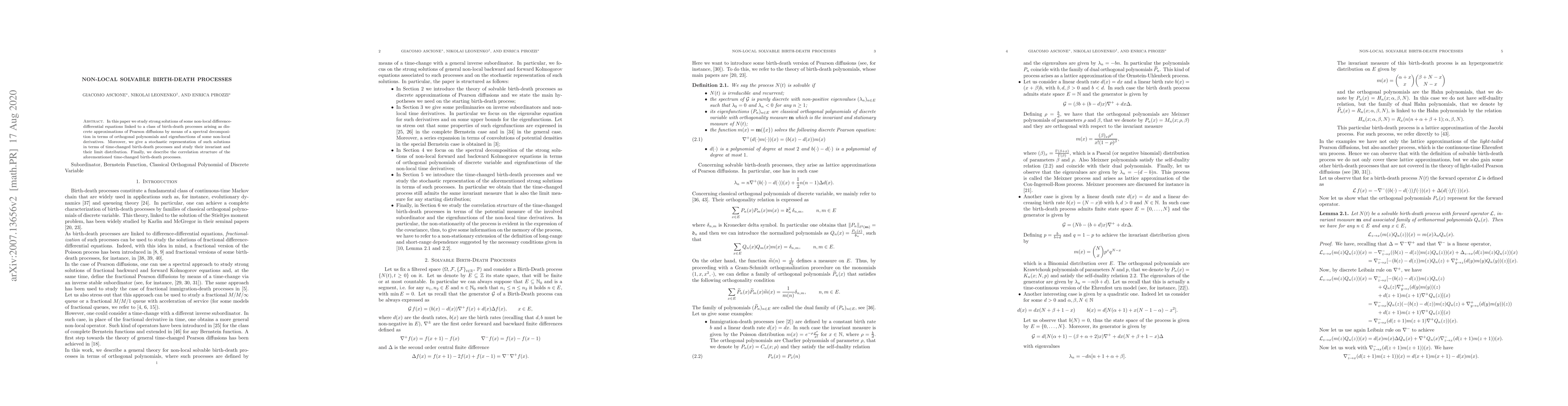 This paper investigates strong solutions for non-local difference-differential equations related to birth-death processes, employing spectral decompositions and orthogonal polynomials. It also provides a stochastic representation and examines the invariant and limit distributions, alongside the correlation structure of the time-changed birth-death processes.