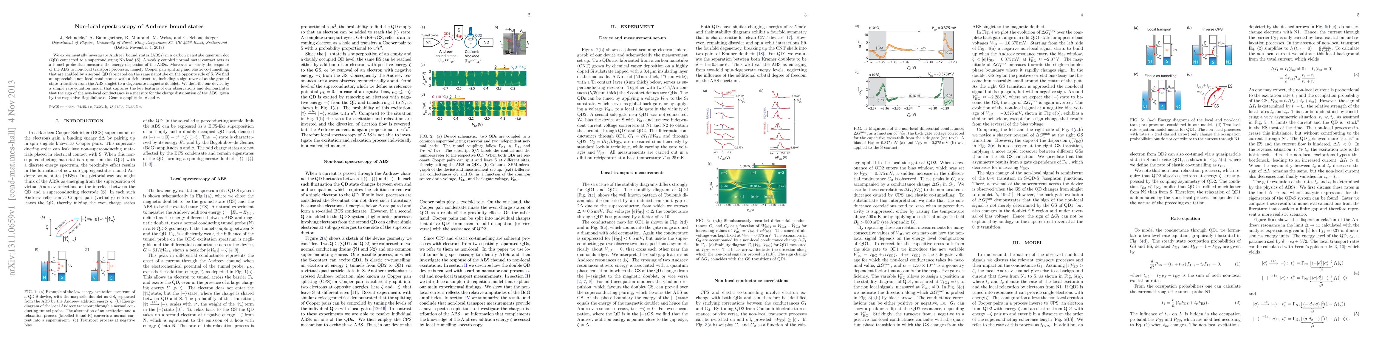 This paper investigates Andreev bound states in a carbon nanotube quantum dot connected to a superconducting lead, using a weakly coupled normal metal contact for spectroscopy. It reveals a significant non-local conductance, including a sign reversal at the transition from ABS singlet to a magnetic doublet, and models the device to show that non-local conductance reflects the ABS charge distribution.