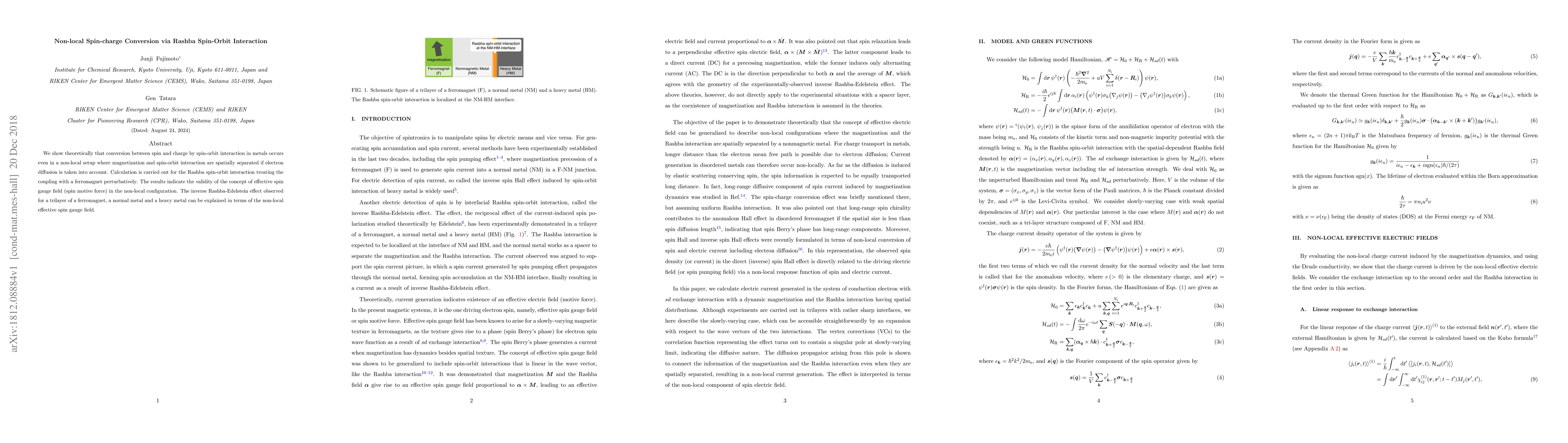 Summary: This research demonstrates theoretically that spin-charge conversion via Rashba spin-orbit interaction is possible in non-local setups, even when magnetization and spin-orbit interaction are spatially separated, by considering electron diffusion. The findings support the concept of an effective spin gauge field and explain the inverse Rashba-Edelstein effect in trilayer structures.