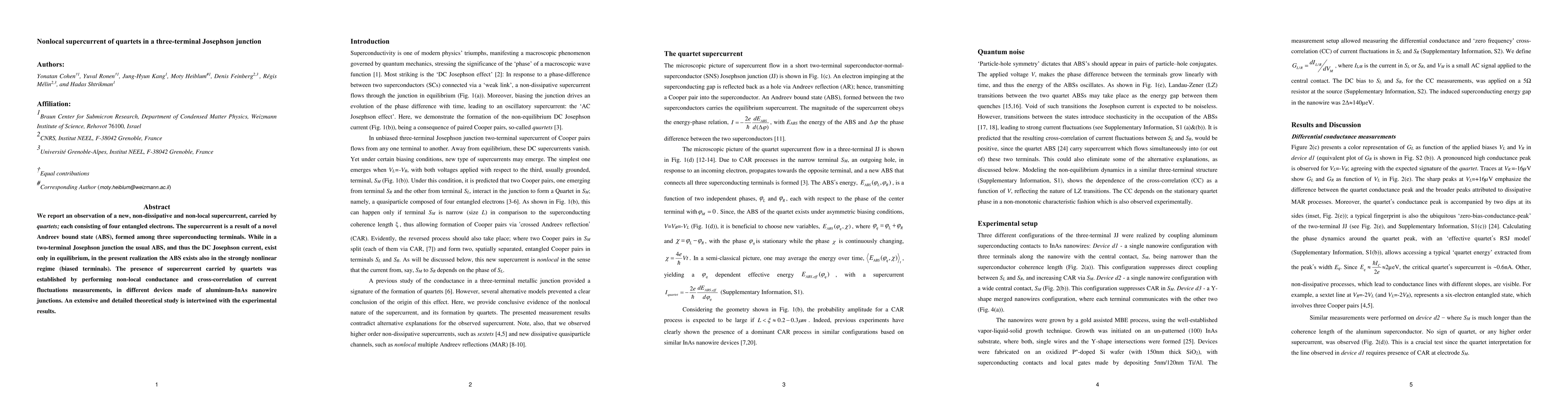 This paper reports the observation of a non-local, non-dissipative supercurrent in a three-terminal Josephson junction, carried by quartets of entangled electrons. The study reveals a novel Andreev bound state that persists in the nonlinear regime, confirmed through non-local conductance and current fluctuations measurements in aluminum-InAs nanowire junctions, supported by theoretical analysis.