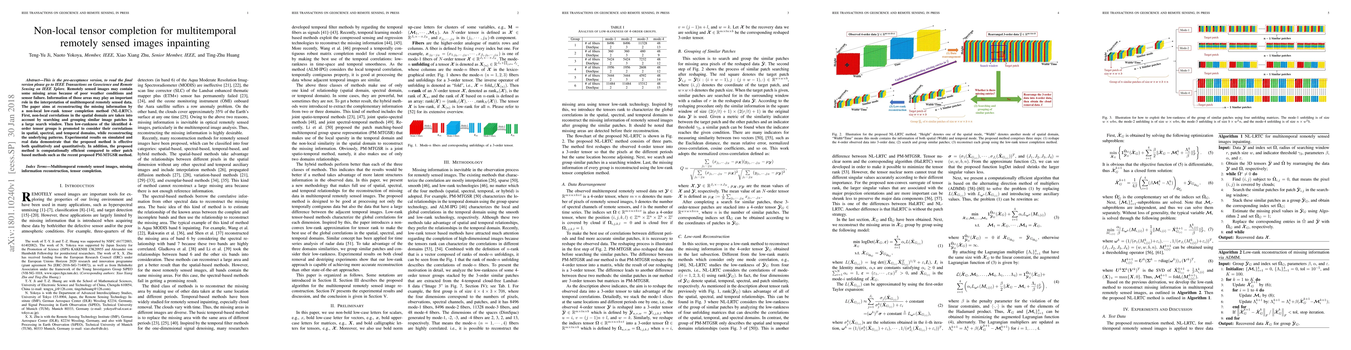 A new method called NL-LRTC is proposed to fill in missing areas of remotely sensed images, using non-local correlations in spatial, spectral, and temporal domains. The method shows promise both qualitatively and quantitatively, and is more computationally efficient than other similar methods.