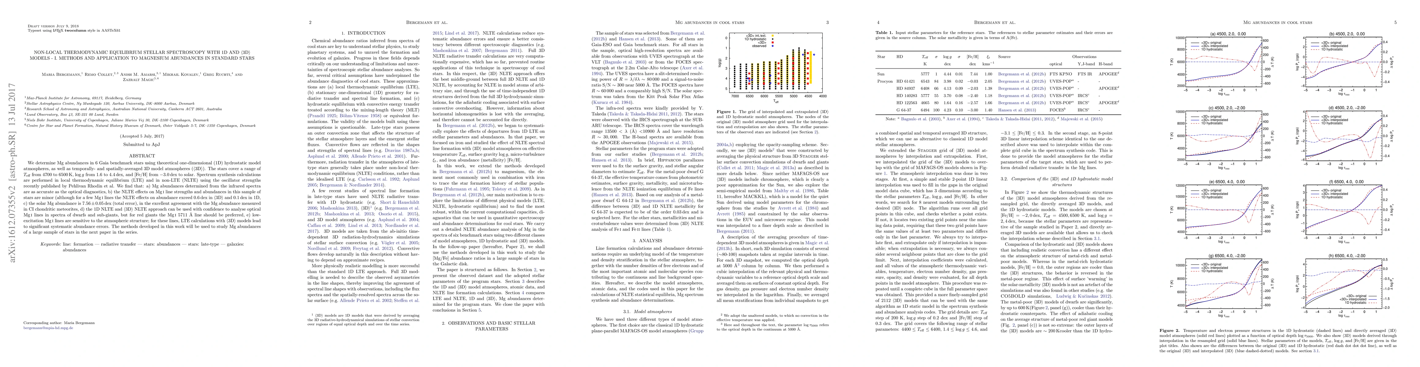This paper investigates Mg abundances in 6 benchmark stars using 1D and <3D> model atmospheres, finding that NLTE effects are minor but significant for some lines. The solar Mg abundance is determined to be 7.56 +/- 0.05 dex, aligning well with meteorite measurements, and the study recommends specific lines for different stellar types.