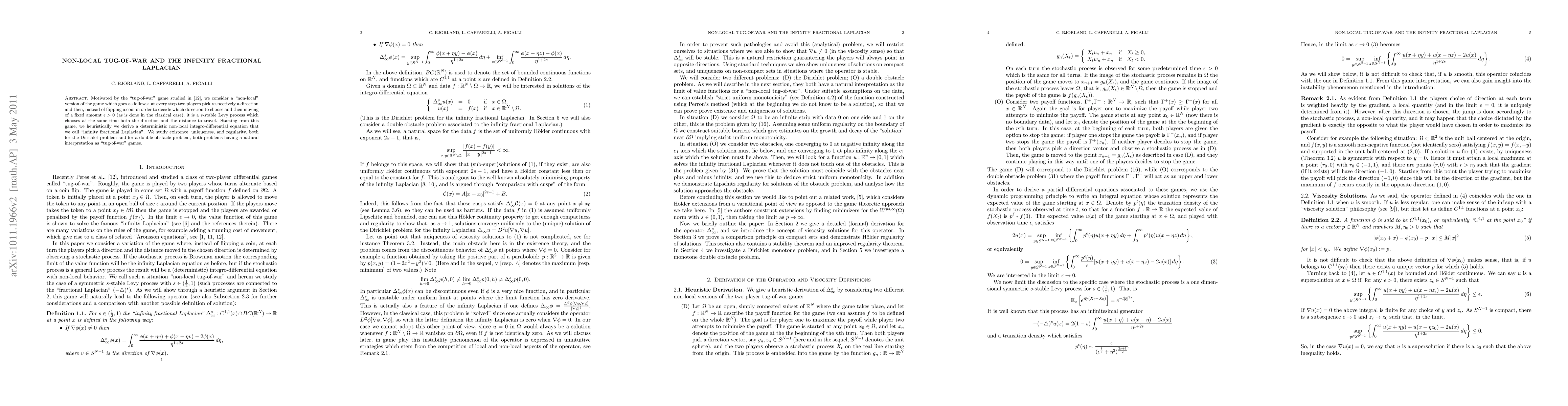This paper explores a non-local version of the "tug-of-war" game using an $s$-stable Levy process, leading to the derivation of a deterministic non-local integro-differential equation termed the "infinity fractional Laplacian." It investigates the existence, uniqueness, and regularity of solutions for both Dirichlet and double obstacle problems.