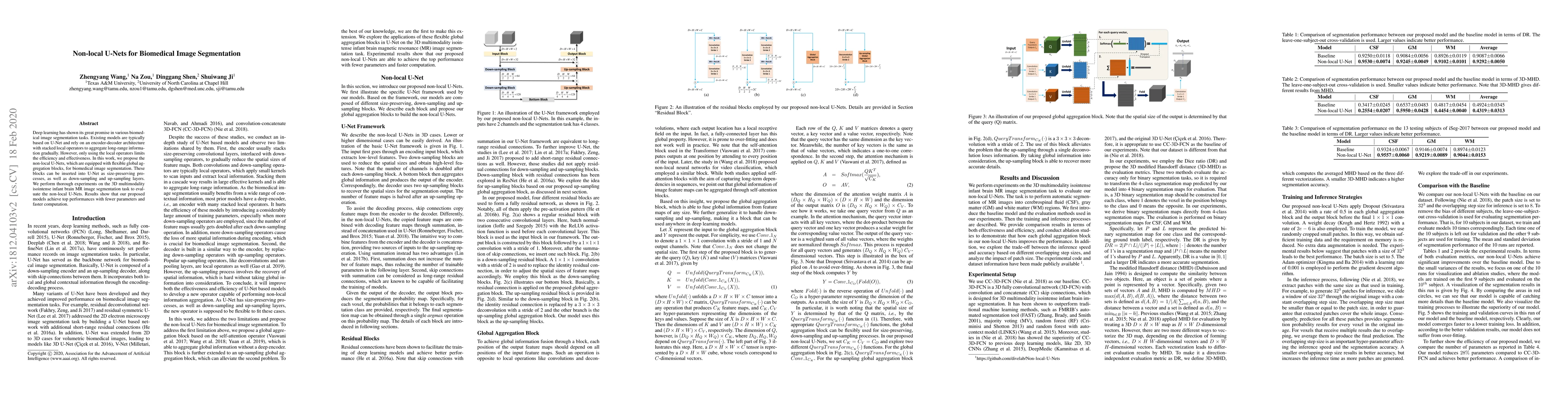 The paper proposes non-local U-Nets for biomedical image segmentation, incorporating global aggregation blocks to enhance efficiency and effectiveness. Experiments on 3D multimodality infant brain MR images demonstrate superior performance, fewer parameters, and faster computation compared to traditional U-Nets.