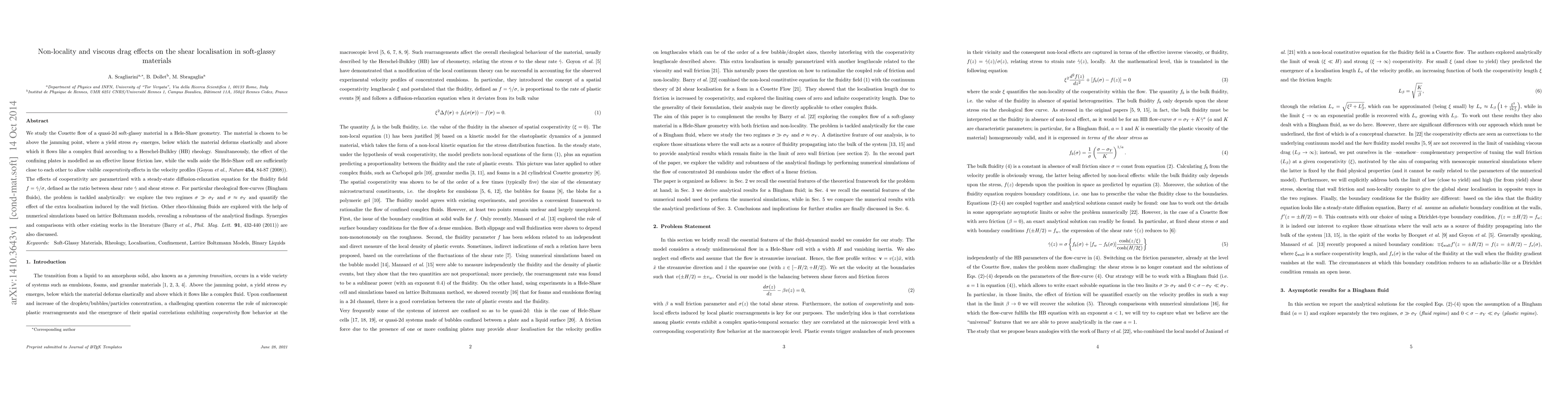 Researchers studied how viscous drag and non-locality affect shear localization in soft-glassy materials, finding that wall friction induces localized deformation and that the material's rheological properties play a key role.