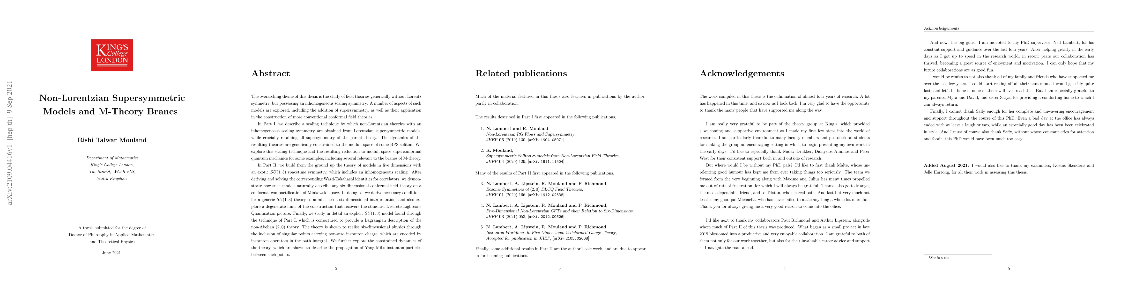 The theme of this thesis is the study of field theories generically without Lorentz symmetry, but possessing an inhomogeneous scaling symmetry. A number of aspects of such models are explored, including the addition of supersymmetry, and their application in the construction of more conventional conformal field theories. In Part I, we describe a scaling technique by which non-Lorentzian theories with an inhomogeneous scaling symmetry are obtained from Lorentzian supersymmetric models, while retaining all supersymmetry of the parent theory. The dynamics of the resulting theories are generically constrained to the moduli space of some BPS soliton. We explore this scaling technique and the resulting reduction to superconformal quantum mechanics for some examples, including several relevant to the branes of M-theory. In Part II, we build from the ground up the theory of models in five dimensions with an exotic $SU(1,3)$ spacetime symmetry, including an inhomogeneous scaling. We derive and solve the corresponding Ward-Takahashi identities for correlators, and demonstrate how such models naturally describe any six-dimensional conformal field theory on a conformal compactification of Minkowski space. We derive necessary conditions for a generic $SU(1,3)$ theory to admit such a six-dimensional interpretation, and also explore a degenerate limit of the construction that recovers the standard DLCQ picture. Finally, we study in detail an explicit $SU(1,3)$ model, conjectured to provide a Lagrangian description of the non-Abelian $(2,0)$ theory. The theory is shown to realise six-dimensional physics through the inclusion of singular points carrying non-zero instanton charge, which are encoded by instanton operators in the path integral. We explore the constrained dynamics of the theory, which are shown to describe the propagation of Yang-Mills instanton-particles between such points.