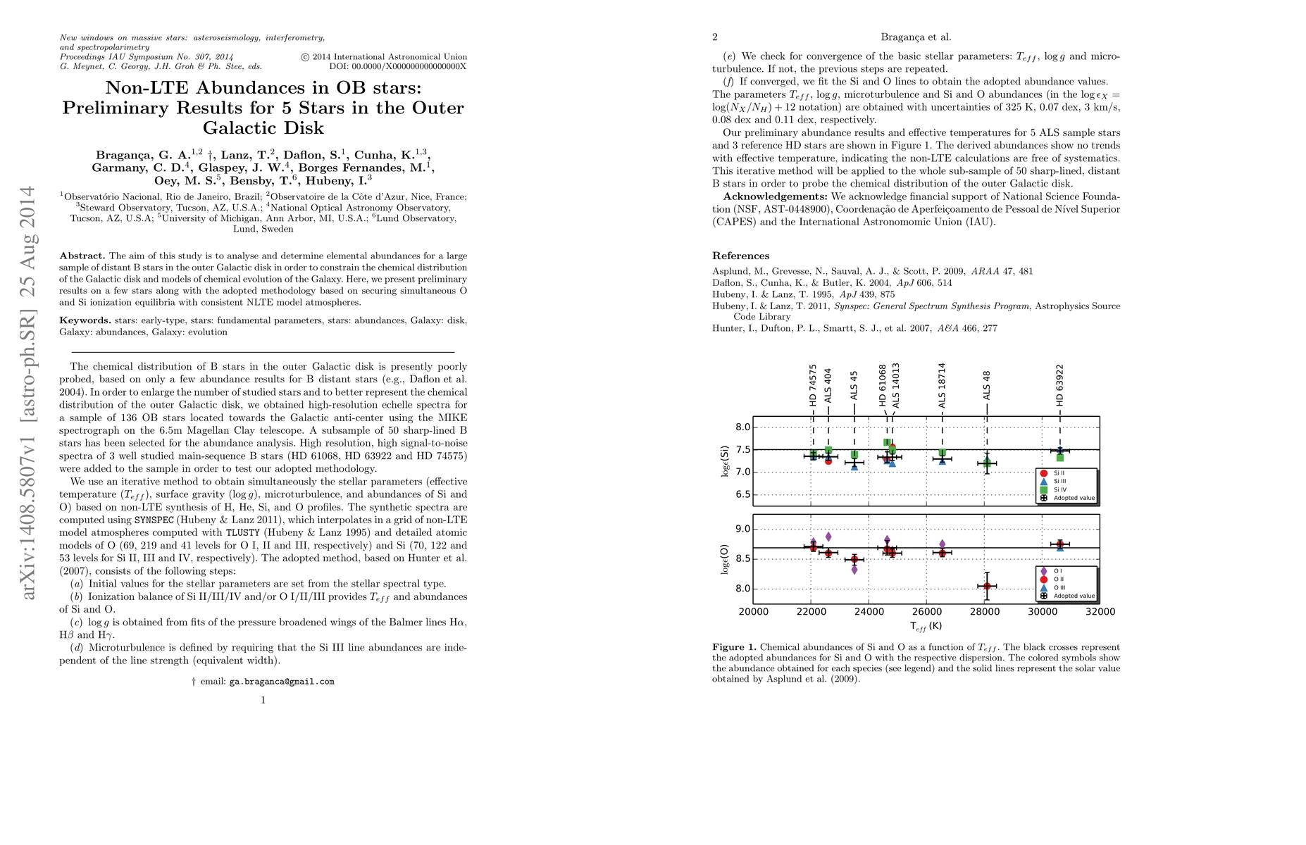 This study aims to determine elemental abundances in distant OB stars in the outer Galactic disk using non-LTE model atmospheres to secure O and Si ionization equilibria, providing preliminary results for five stars to constrain the chemical distribution and evolution of the Galaxy.