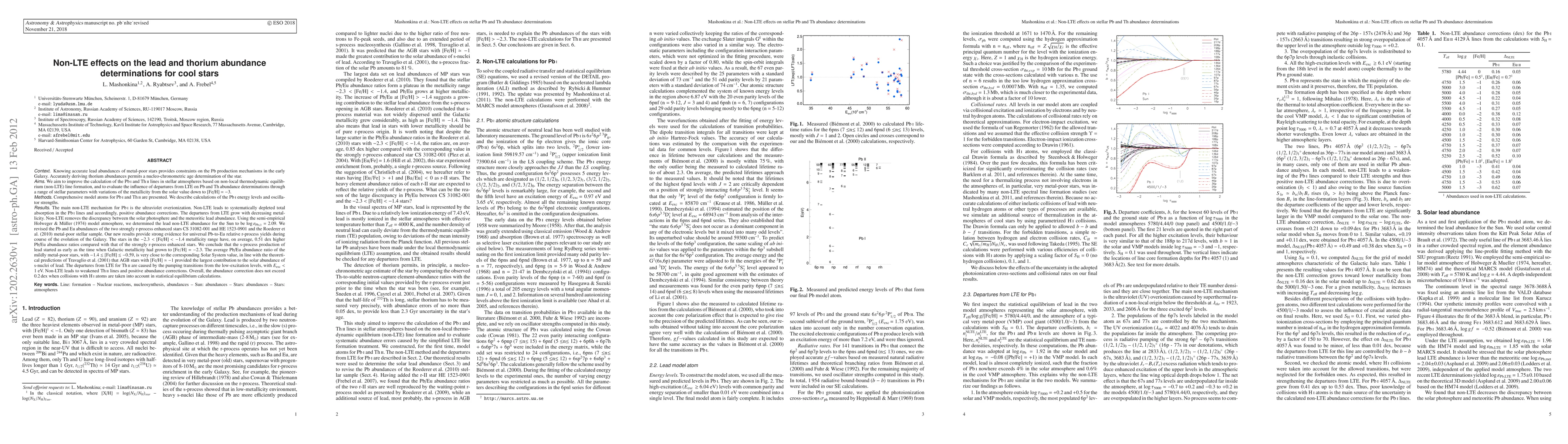 This paper investigates non-LTE effects on lead (Pb) and thorium (Th) abundance determinations in cool stars, revealing systematic depletions in Pb I lines and positive abundance corrections due to non-LTE. The study revises Pb and Eu abundances in selected stars, providing evidence for universal Pb/Eu relative r-process yields and suggesting early s-process synthesis of Pb at [Fe/H] = -2.3.
