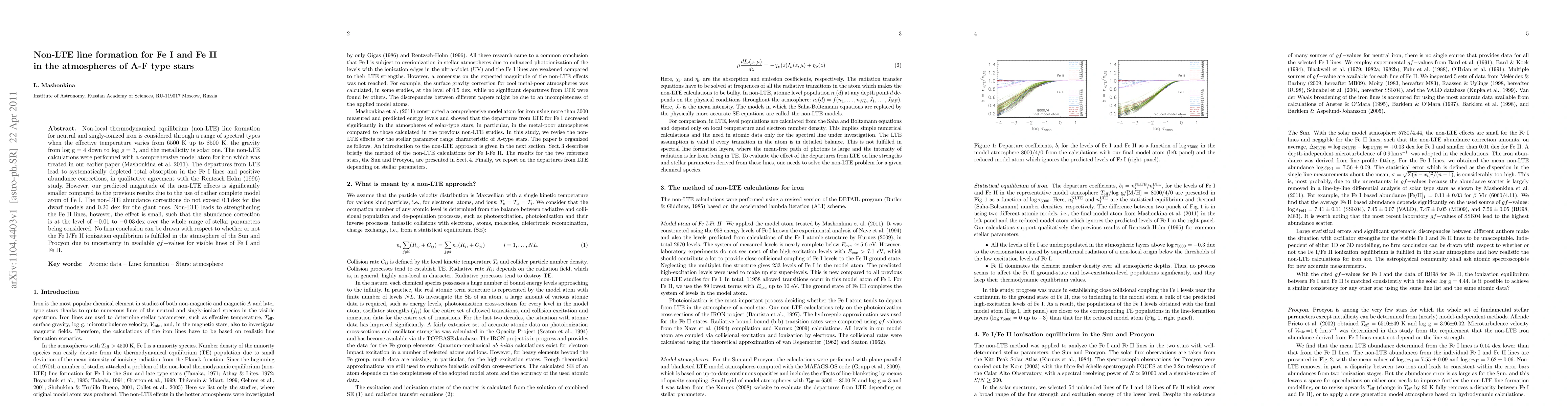 This study investigates non-LTE line formation for iron in stars of different spectral types, finding small abundance corrections for Fe I and weak effects on Fe II, with implications for understanding ionization equilibria in stellar atmospheres.