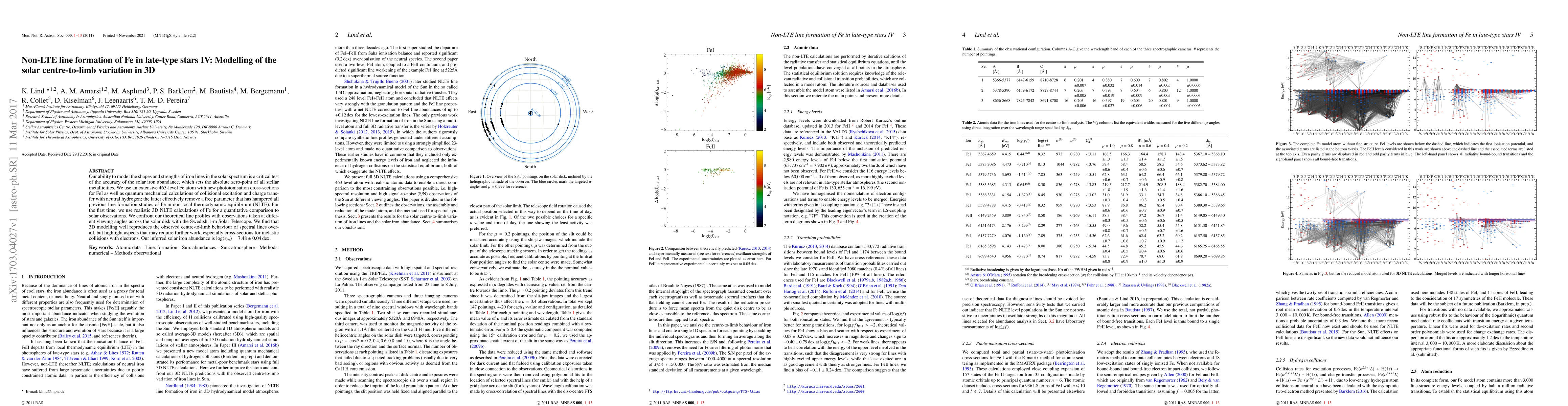 Our ability to model the shapes and strengths of iron lines in the solar spectrum is a critical test of the accuracy of the solar iron abundance, which sets the absolute zero-point of all stellar metallicities. We use an extensive 463-level Fe atom with new photoionisation cross-sections for FeI as well as quantum mechanical calculations of collisional excitation and charge transfer with neutral hydrogen; the latter effectively remove a free parameter that has hampered all previous line formation studies of Fe in non-local thermodynamic equilibrium (NLTE). For the first time, we use realistic 3D NLTE calculations of Fe for a quantitative comparison to solar observations. We confront our theoretical line profiles with observations taken at different viewing angles across the solar disk with the Swedish 1-m Solar Telescope. We find that 3D modelling well reproduces the observed centre-to-limb behaviour of spectral lines overall, but highlight aspects that may require further work, especially cross-sections for inelastic collisions with electrons. Our inferred solar iron abundance is log(eps(Fe))=7.48+-0.04.