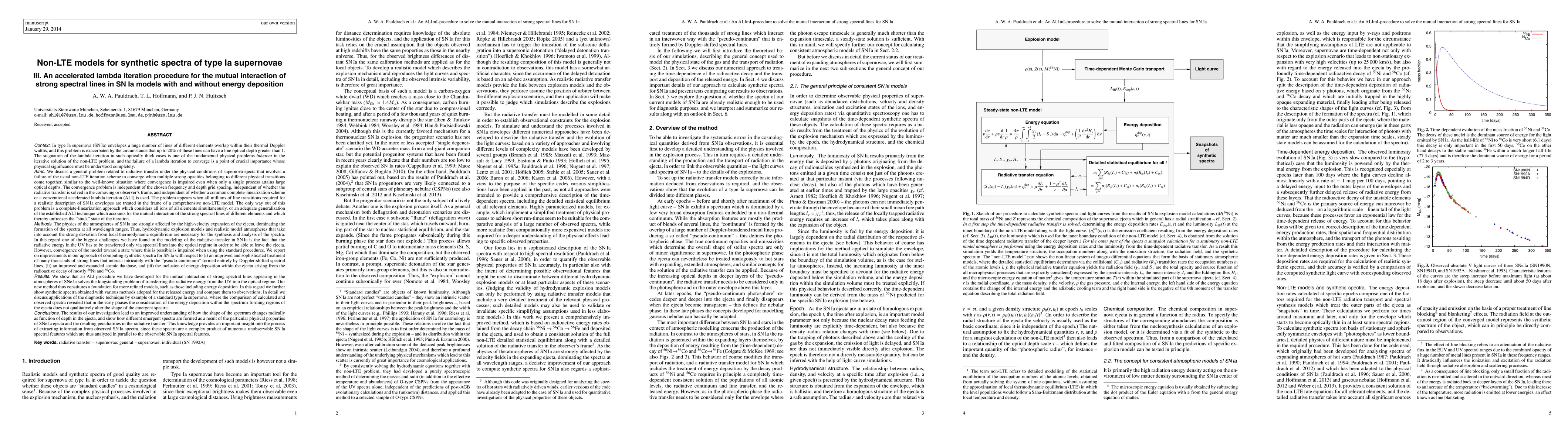 Context. Spectroscopic analyses to interpret the spectra of the brightest supernovae from the UV to the near-IR provide a powerful tool with great astrophysical potential for the determination of the physical state of the ejecta, their chemical composition, and the SNe distances even at significant redshifts. Methods. We report on improvements of computing synthetic spectra for SNIa with respect to i) an improved and sophisticated treatment of thousands of strong lines that interact intricately with the "pseudo-continuum" formed entirely by Doppler- shifted spectral lines, ii) an improved and expanded atomic database, and iii) the inclusion of energy deposition within the ejecta. Results. We show that an accelerated lambda iteration procedure we have developed for the mutual interaction of strong spectral lines appearing in the atmospheres of SNeIa solves the longstanding problem of transferring the radiative energy from the UV into the optical regime. In detail we discuss applications of the diagnostic technique by example of a standard SNIa, where the comparison of calculated and observed spectra revealed that in the early phases the consideration of the energy deposition within the spectrum-forming regions of the ejecta does not qualitatively alter the shape of the spectra. Conclusions. The results of our investigation lead to an improved understanding of how the shape of the spectrum changes radically as function of depth in the ejecta, and show how different emergent spectra are formed as a result of the particular physical properties of SNe Ia ejecta and the resulting peculiarities in the radiative transfer. This provides an important insight into the process of extracting information from observed SNIa spectra, since these spectra are a complex product of numerous unobservable SNIa spectral features which are thus analyzed in parallel to the observable spectral features.