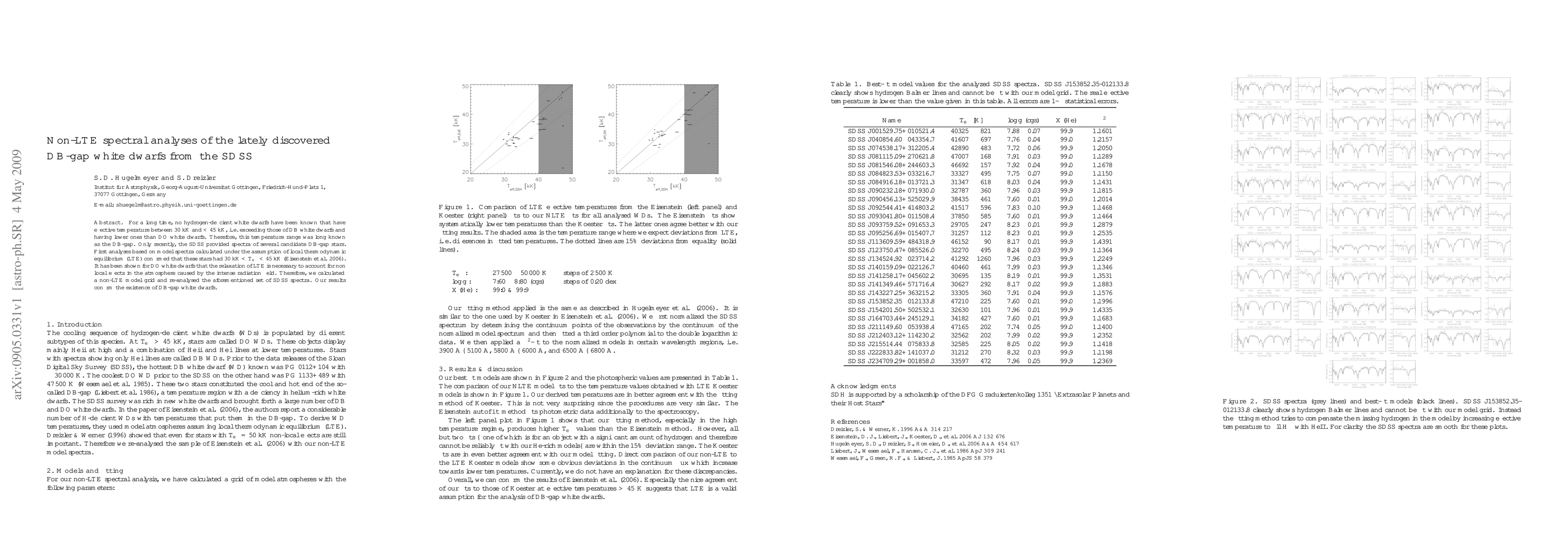 This paper presents non-LTE spectral analyses of recently discovered DB-gap white dwarfs from the SDSS, confirming their existence in the temperature range 30 kK to 45 kK, a region previously thought to lack hydrogen-deficient white dwarfs. Non-LTE modeling was used to account for the intense radiation field effects.