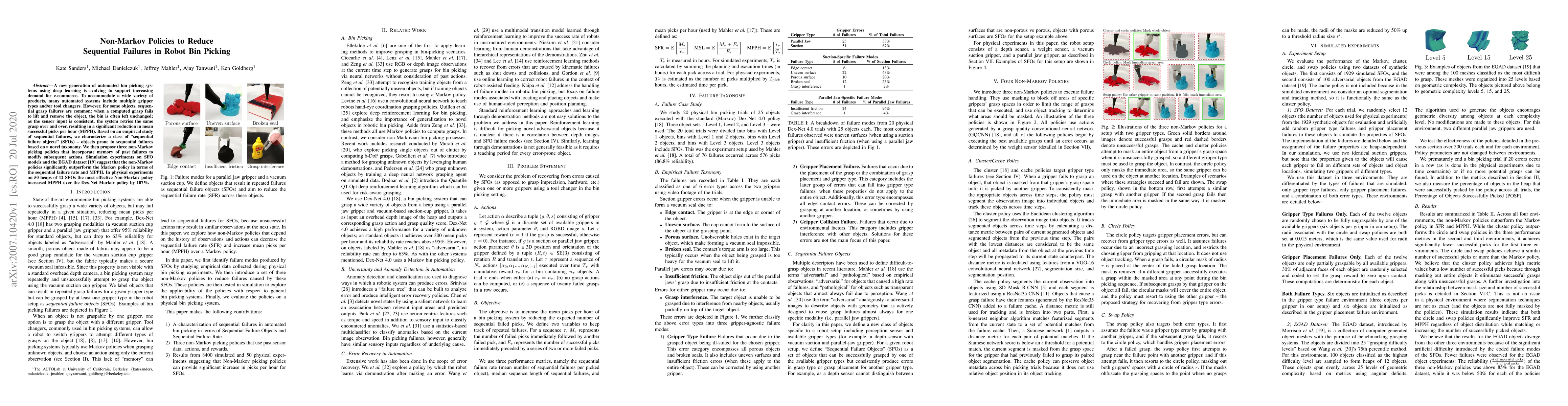 A new generation of automated bin picking systems using deep learning is evolving to support increasing demand for e-commerce. To accommodate a wide variety of products, many automated systems include multiple gripper types and/or tool changers. However, for some objects, sequential grasp failures are common: when a computed grasp fails to lift and remove the object, the bin is often left unchanged; as the sensor input is consistent, the system retries the same grasp over and over, resulting in a significant reduction in mean successful picks per hour (MPPH). Based on an empirical study of sequential failures, we characterize a class of "sequential failure objects" (SFOs) -- objects prone to sequential failures based on a novel taxonomy. We then propose three non-Markov picking policies that incorporate memory of past failures to modify subsequent actions. Simulation experiments on SFO models and the EGAD dataset suggest that the non-Markov policies significantly outperform the Markov policy in terms of the sequential failure rate and MPPH. In physical experiments on 50 heaps of 12 SFOs the most effective Non-Markov policy increased MPPH over the Dex-Net Markov policy by 107%.