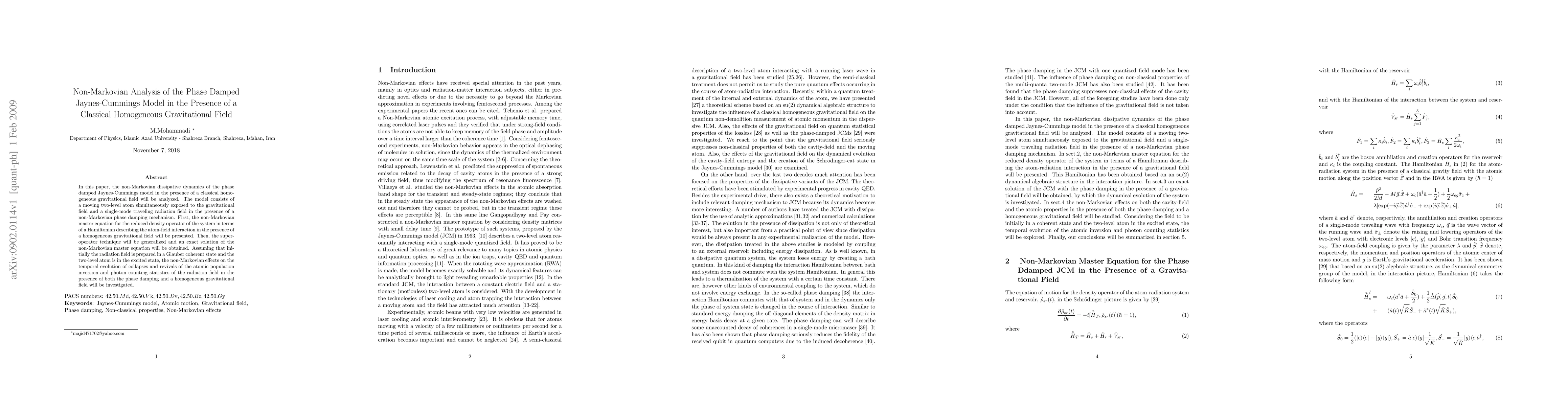 This paper analyzes the non-Markovian dynamics of a phase damped Jaynes-Cummings model under a classical homogeneous gravitational field, deriving a non-Markovian master equation and obtaining an exact solution. It investigates the effects on atomic population inversion and photon statistics due to phase damping and gravity.