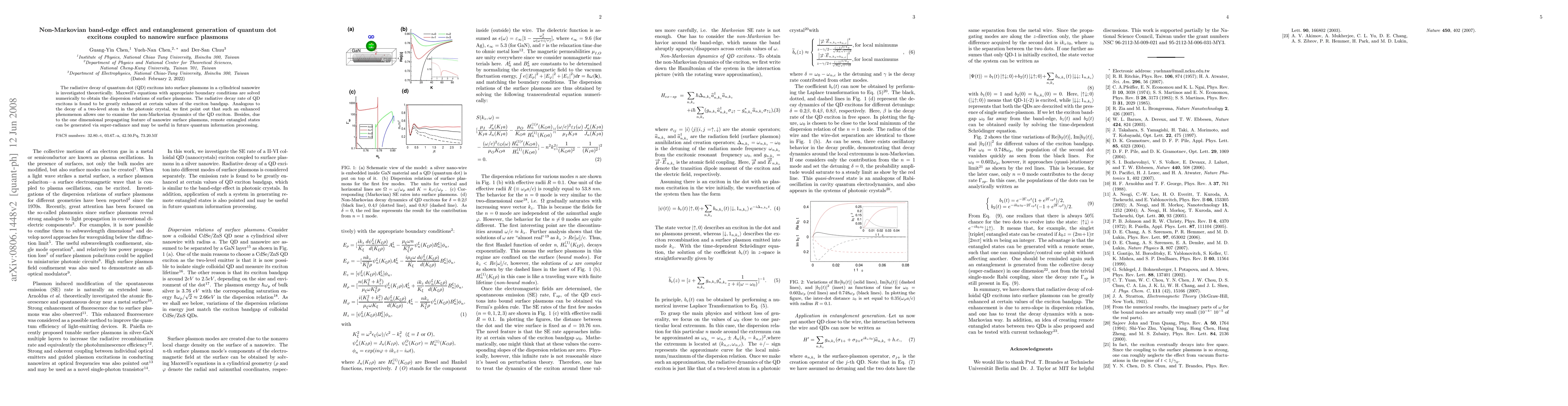 This paper investigates the enhanced radiative decay of quantum dot excitons into nanowire surface plasmons, revealing non-Markovian dynamics at specific bandgaps. It also demonstrates the potential for generating remote entangled states via super-radiance, which could be beneficial for future quantum information processing.