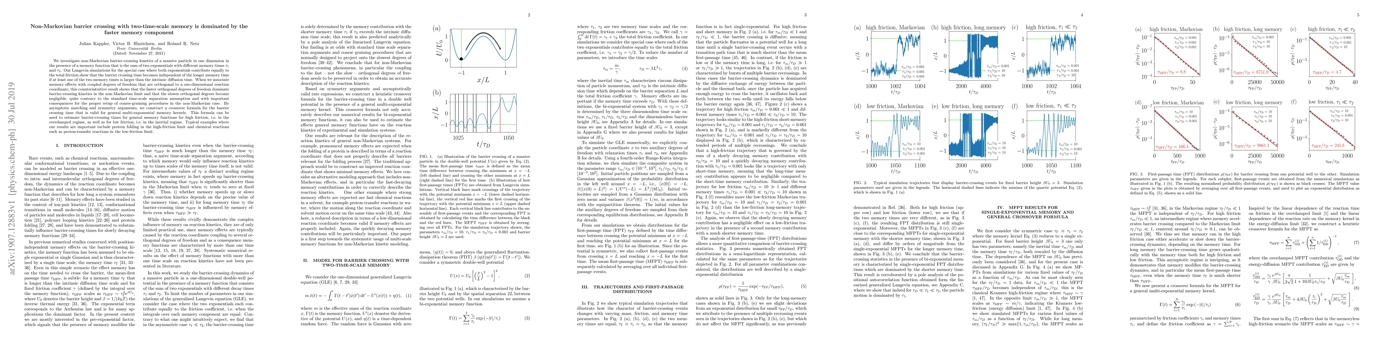 This paper investigates non-Markovian barrier-crossing kinetics in a one-dimensional system, revealing that the faster memory component dominates the process, contrary to the typical time-scale separation assumption. The study provides a crossover formula for estimating barrier-crossing times under various friction regimes, with implications for protein folding and chemical reactions.