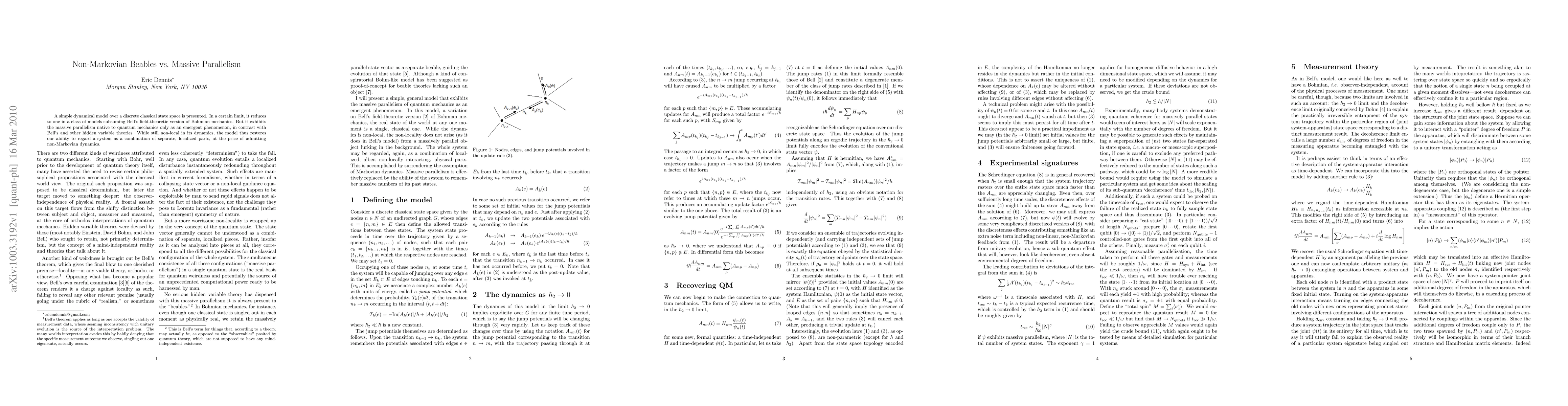 This paper proposes a dynamical model over a discrete classical state space that, in a certain limit, aligns with Bohmian mechanics but emerges as non-Markovian. Unlike other hidden variable theories, it demonstrates massive parallelism inherent in quantum mechanics as an emergent feature, maintaining a non-local yet part-based view of systems.