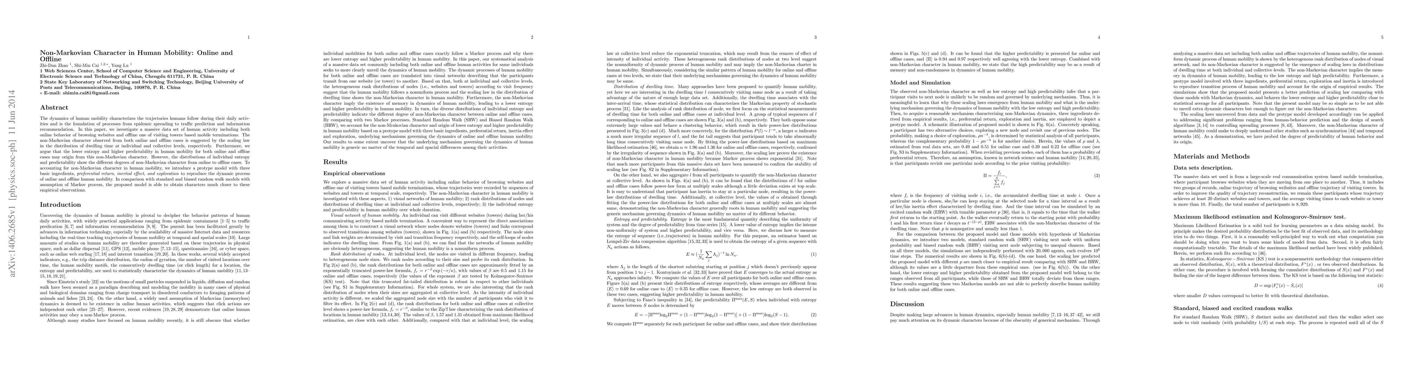 The dynamics of human mobility characterizes the trajectories humans follow during their daily activities and is the foundation of processes from epidemic spreading to traffic prediction and information recommendation. In this paper, we investigate a massive data set of human activity including both online behavior of browsing websites and offline one of visiting towers based mobile terminations. The non-Markovian character observed from both online and offline cases is suggested by the scaling law in the distribution of dwelling time at individual and collective levels, respectively. Furthermore, we argue that the lower entropy and higher predictability in human mobility for both online and offline cases may origin from this non-Markovian character. However, the distributions of individual entropy and predictability show the different degrees of non-Markovian character from online to offline cases. To accounting for non-Markovian character in human mobility, we introduce a protype model with three basic ingredients, \emph{preferential return, inertial effect, and exploration} to reproduce the dynamic process of online and offline human mobility. In comparison with standard and biased random walk models with assumption of Markov process, the proposed model is able to obtain characters much closer to these empirical observations.
