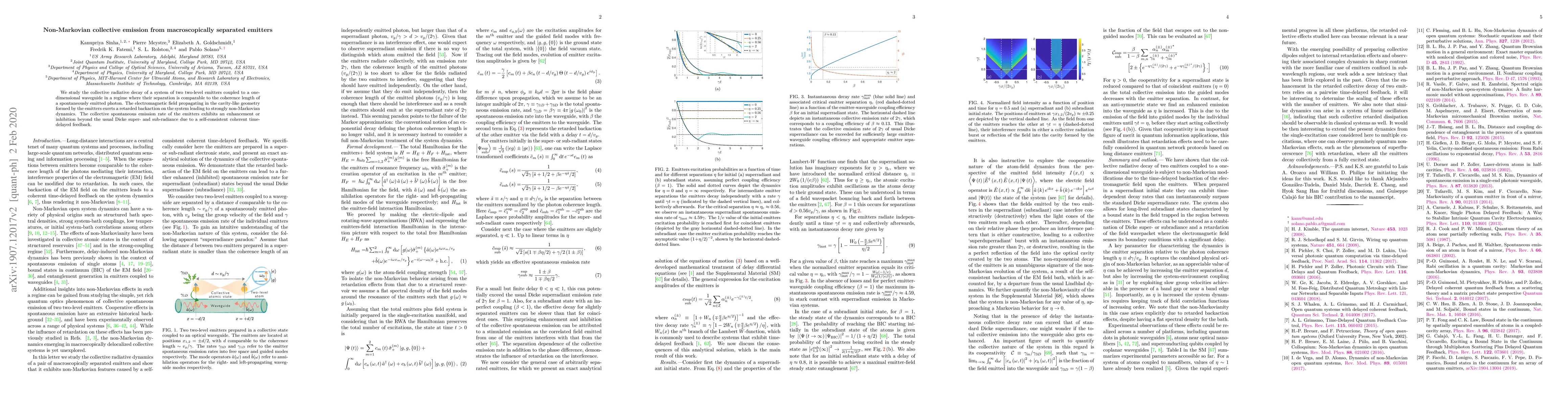 This paper investigates the collective radiative decay of two spatially separated two-level emitters coupled to a one-dimensional waveguide, revealing non-Markovian dynamics due to the electromagnetic field's retarded backaction. The study finds that the collective emission rate can be enhanced or inhibited beyond typical super- and sub-radiance effects, owing to coherent time-delayed feedback.