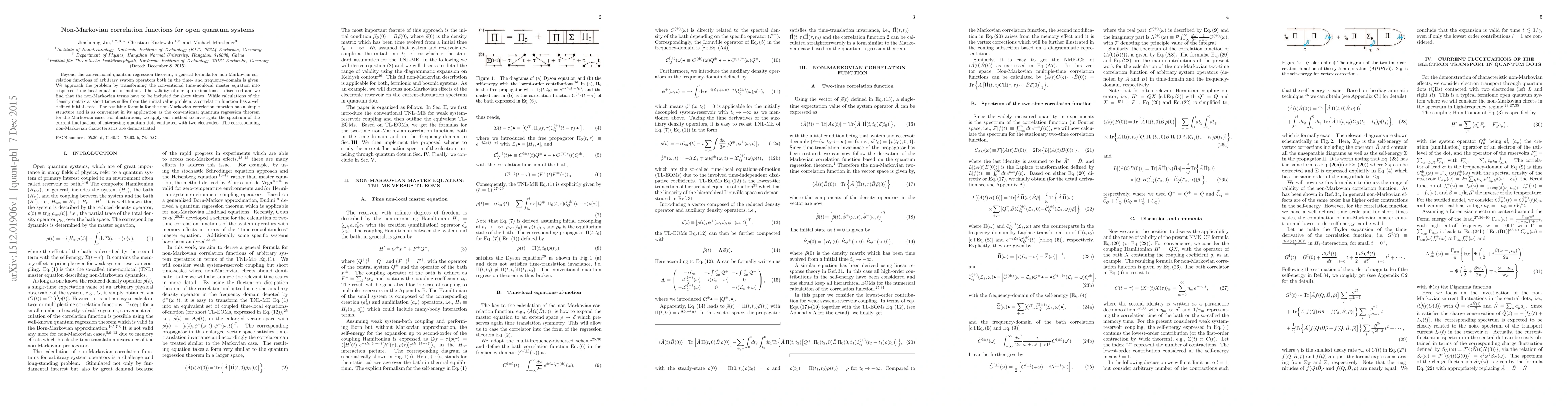 This paper presents a general formula for non-Markovian correlation functions in open quantum systems, transforming time-nonlocal master equations into time-local equations-of-motion. The method is shown to be valid for short times, highlighting the importance of including non-Markovian terms, and is applied to study current fluctuations in interacting quantum dots.