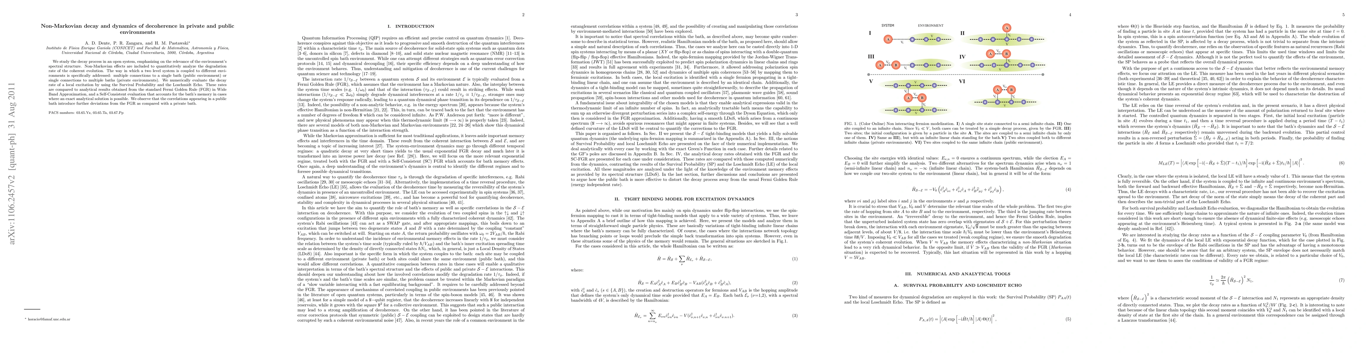 We study the decay process in an open system, emphasizing on the relevance of the environment's spectral structure. Non-Markovian effects are included to quantitatively analyze the degradation rate of the coherent evolution. The way in which a two level system is coupled to different environments is specifically addressed: multiple connections to a single bath (public environment)or single connections to multiple baths (private environments). We numerically evaluate the decay rate of a local excitation by using the Survival Probability and the Loschmidt Echo. These rates are compared to analytical results obtained from the standard Fermi Golden Rule (FGR) in Wide Band Approximation, and a Self-Consistent evaluation that accounts for the bath's memory in cases where an exact analytical solution is possible. We observe that the correlations appearing in a public bath introduce further deviations from the FGR as compared with a private bath.