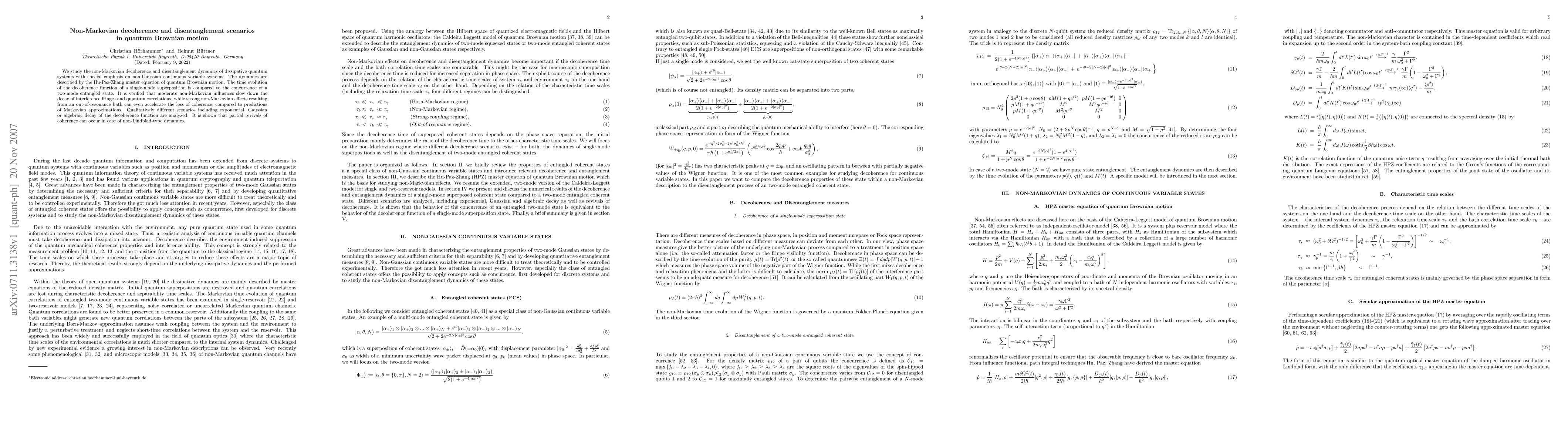 This paper investigates non-Markovian decoherence and disentanglement in quantum Brownian motion, focusing on non-Gaussian continuous variable systems. It finds that moderate non-Markovian effects can slow down the decay of interference and quantum correlations, while strong non-Markovian influences can accelerate coherence loss, contrasting with Markovian predictions, and explores various decay scenarios including partial revivals of coherence.