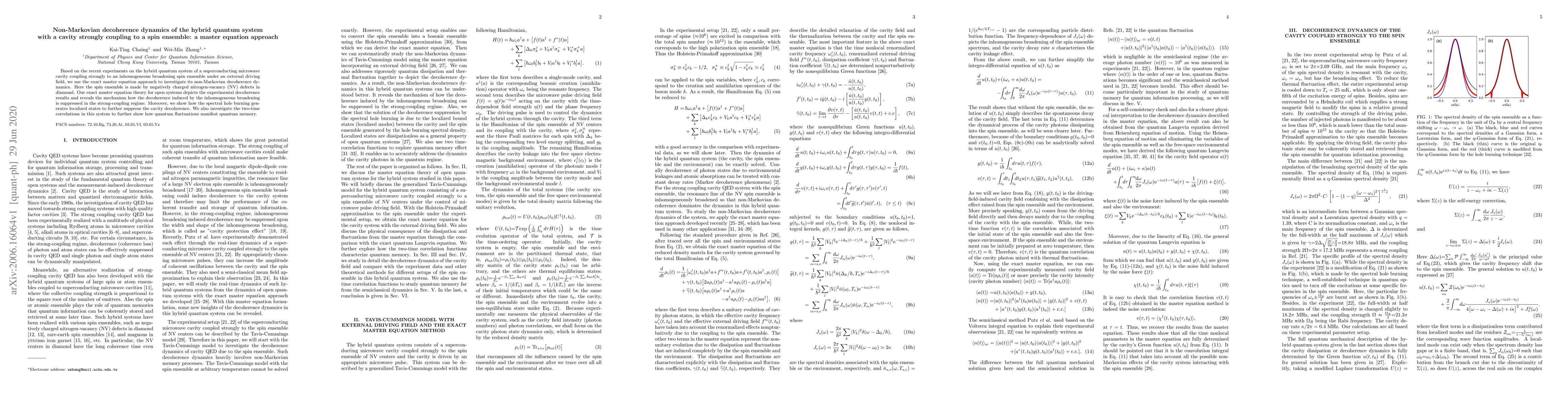 Based on the recent experiments on the hybrid quantum system of a superconducting microwave cavity coupling strongly to an inhomogeneous broadening spin ensemble under an external driving field, we use the exact master equation approach to investigate its non-Markovian decoherence dynamics. Here the spin ensemble is made by negatively charged nitrogen-vacancy (NV) defects in diamond. Our exact master equation theory for open systems depicts the experimental decoherence results and reveals the mechanism how the decoherence induced by the inhomogeneous broadening is suppressed in the strong-coupling regime. Moreover, we show how the spectral hole burning generates localized states to further suppress the cavity decoherence. We also investigate the two-time correlations in this system to further show how quantum fluctuations manifest quantum memory.