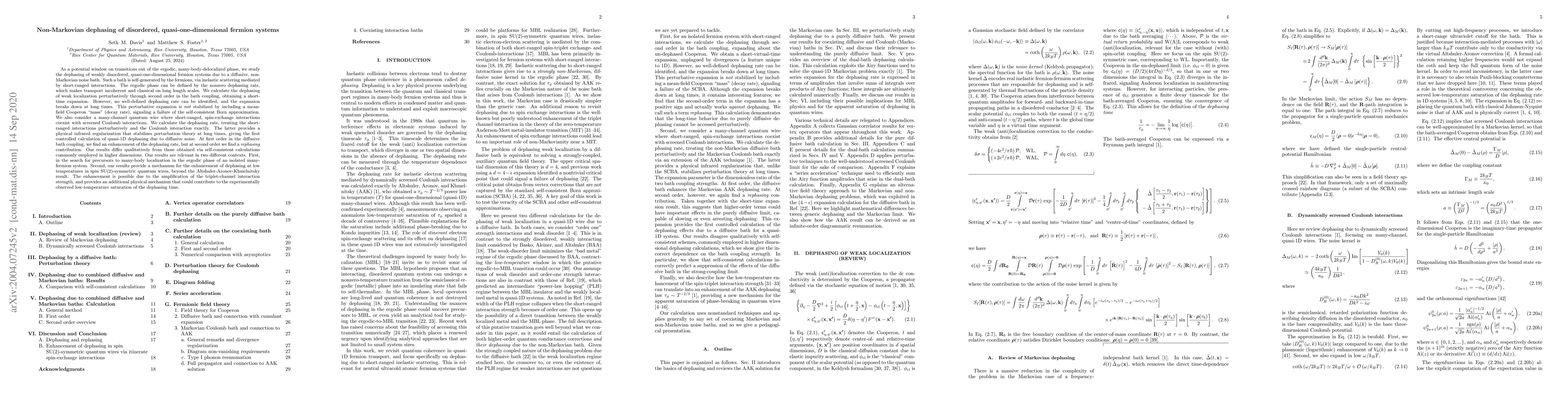 As a potential window on transitions out of the ergodic, many-body-delocalized phase, we study the dephasing of weakly disordered, quasi-one-dimensional fermion systems due to a diffusive, non-Markovian noise bath. Such a bath is self-generated by the fermions, via inelastic scattering mediated by short-ranged interactions. We calculate the dephasing of weak localization perturbatively through second order in the bath coupling. However, the expansion breaks down at long times, and is not stabilized by including a mean-field decay rate, signaling a failure of the self-consistent Born approximation. We also consider a many-channel quantum wire where short-ranged, spin-exchange interactions coexist with screened Coulomb interactions. We calculate the dephasing rate, treating the short-ranged interactions perturbatively and the Coulomb interaction exactly. The latter provides a physical infrared regularization that stabilizes perturbation theory at long times, giving the first controlled calculation of quasi-1D dephasing due to diffusive noise. At first order in the diffusive bath coupling, we find an enhancement of the dephasing rate, but at second order we find a rephasing contribution. Our results differ qualitatively from those obtained via self-consistent calculations and are relevant in two different contexts. First, in the search for precursors to many-body localization in the ergodic phase. Second, our results provide a mechanism for the enhancement of dephasing at low temperatures in spin SU(2)-symmetric quantum wires, beyond the Altshuler-Aronov-Khmelnitsky result. The enhancement is possible due to the amplification of the triplet-channel interaction strength, and provides an additional mechanism that could contribute to the experimentally observed low-temperature saturation of the dephasing time.