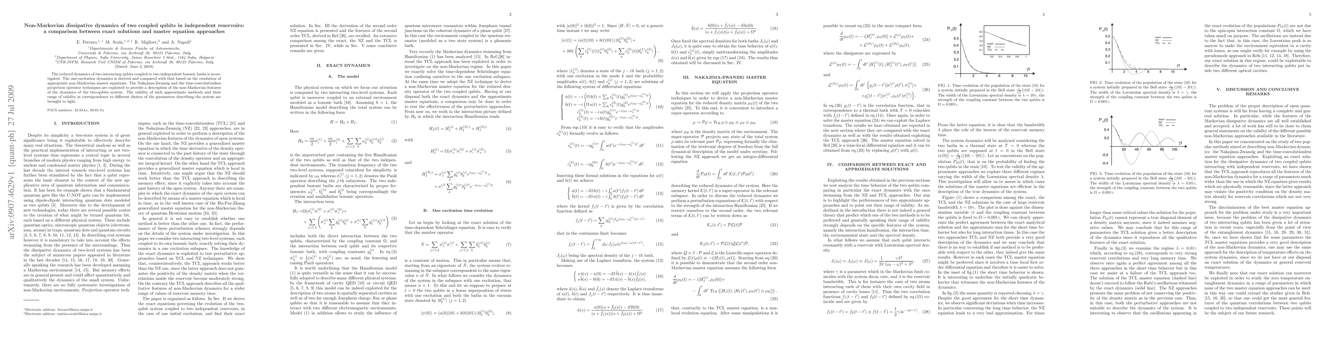 This paper investigates the non-Markovian dynamics of two coupled qubits in separate reservoirs, deriving exact solutions and comparing them with approximations from non-Markovian master equations. It highlights the validity and limitations of these approximate methods under various system parameters.