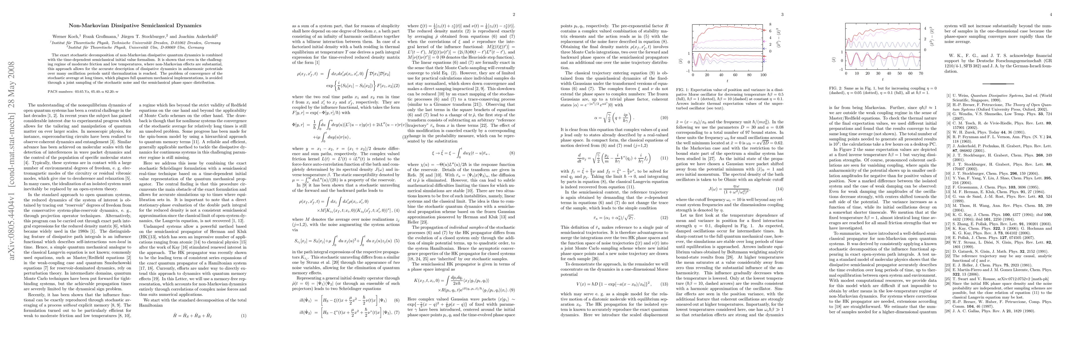 This paper combines non-Markovian quantum dynamics with semiclassical initial value formalism to accurately describe dissipative dynamics in anharmonic potentials under moderate friction and low temperatures. It avoids long-time convergence issues by jointly sampling stochastic noise and semiclassical phase space distribution.