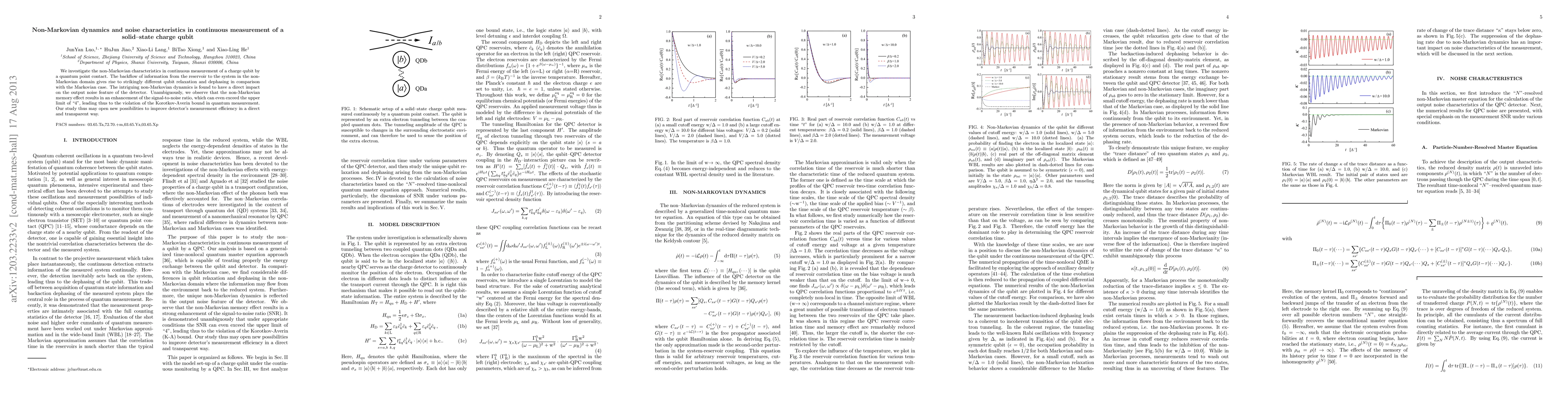 The research investigates non-Markovian dynamics in continuous measurement of a solid-state charge qubit using a quantum point contact (QPC). The study varies the cutoff energy to analyze the memory effects on qubit relaxation, dephasing, and detector noise characteristics.