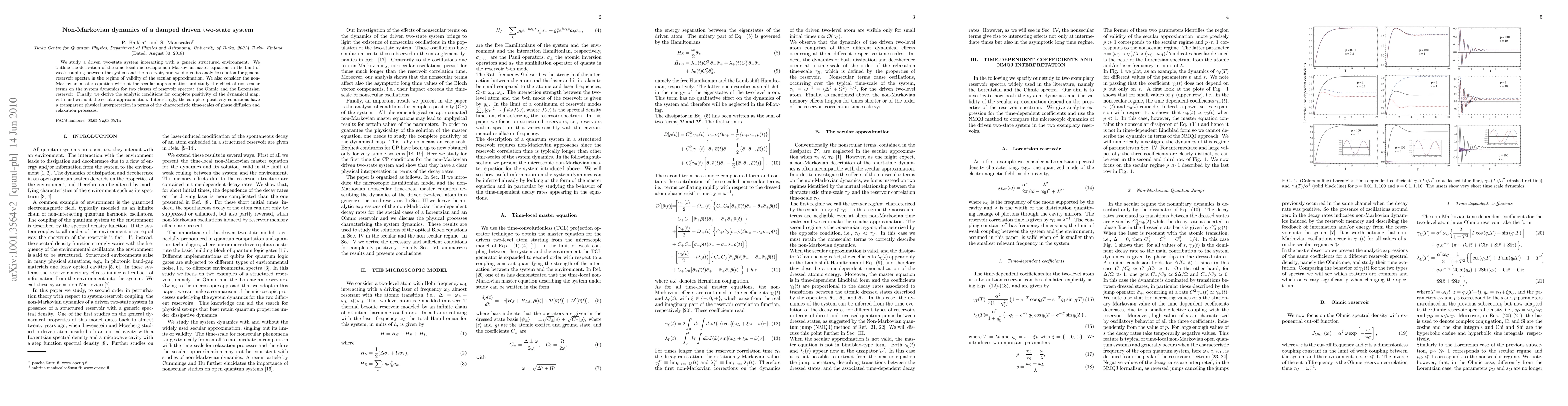 This paper investigates the non-Markovian dynamics of a driven two-state system coupled to a structured environment, deriving an analytic solution for its master equation. It compares the dynamics under Ohmic and Lorentzian reservoir spectra and provides conditions for complete positivity, revealing physical interpretations in terms of phase diffusion and relaxation timescales.