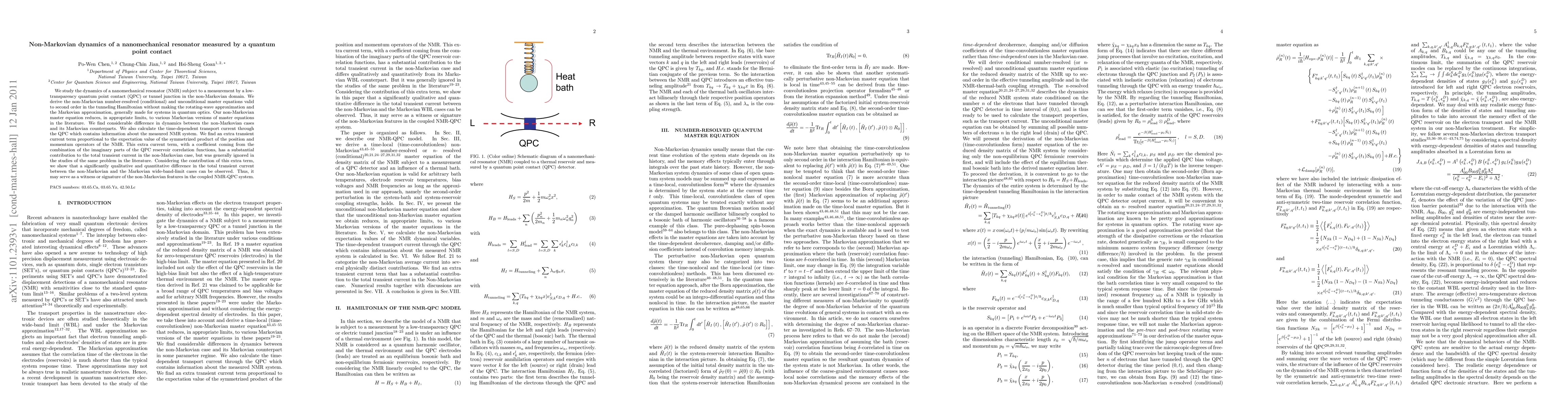 We study the dynamics of a nanomechanical resonator (NMR) subject to a measurement by a low transparency quantum point contact (QPC) or tunnel junction in the non-Markovian domain. We derive the non-Markovian number-resolved (conditional) and unconditional master equations valid to second order in the tunneling Hamiltonian without making the rotating-wave approximation and the Markovian approximation, generally made for systems in quantum optics. Our non-Markovian master equation reduces, in appropriate limits, to various Markovian versions of master equations in the literature. We find considerable difference in dynamics between the non-Markovian cases and its Markovian counterparts. We also calculate the time-dependent transport current through the QPC which contains information about the measured NMR system. We find an extra transient current term proportional to the expectation value of the symmetrized product of the position and momentum operators of the NMR. This extra current term, with a coefficient coming from the combination of the imaginary parts of the QPC reservoir correlation functions, has a substantial contribution to the total transient current in the non-Markovian case, but was generally ignored in the studies of the same problem in the literature. Considering the contribution of this extra term, we show that a significantly qualitative and quantitative difference in the total transient current between the non-Markovian and the Markovian wide-band-limit cases can be observed. Thus, it may serve as a witness or signature of the non-Markovian features in the coupled NMR-QPC system.