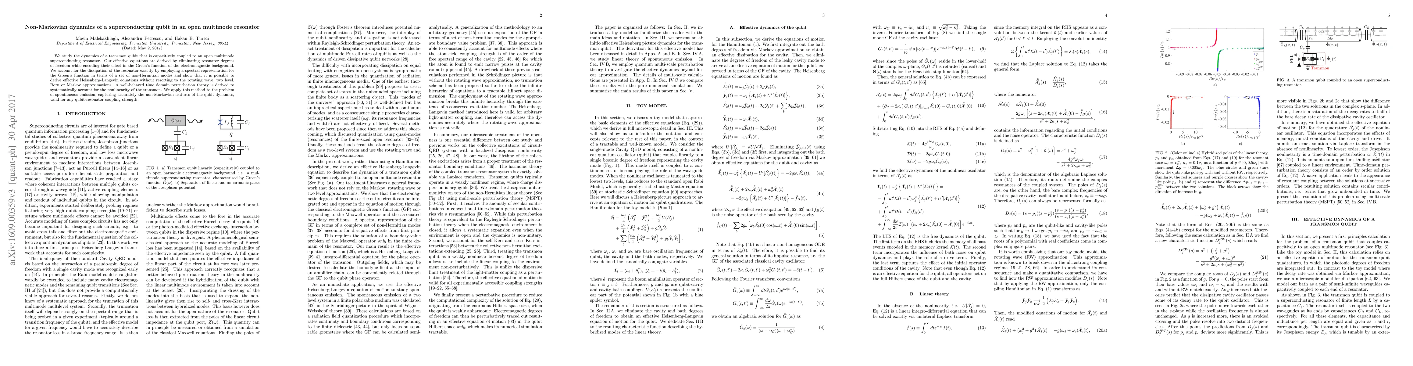 We study the dynamics of a transmon qubit that is capacitively coupled to an open multimode superconducting resonator. Our effective equations are derived by eliminating resonator degrees of freedom while encoding their effect in the Green's function of the electromagnetic background. We account for the dissipation of the resonator exactly by employing a spectral representation for the Green's function in terms of a set of non-Hermitian modes and show that it is possible to derive effective Heisenberg-Langevin equations without resorting to the rotating wave, two level or Markov approximations. A well-behaved time domain perturbation theory is derived to systematically account for the nonlinearity of the transmon. We apply this method to the problem of spontaneous emission, capturing accurately the non-Markovian features of the qubit dynamics, valid for any qubit-resonator coupling strength.