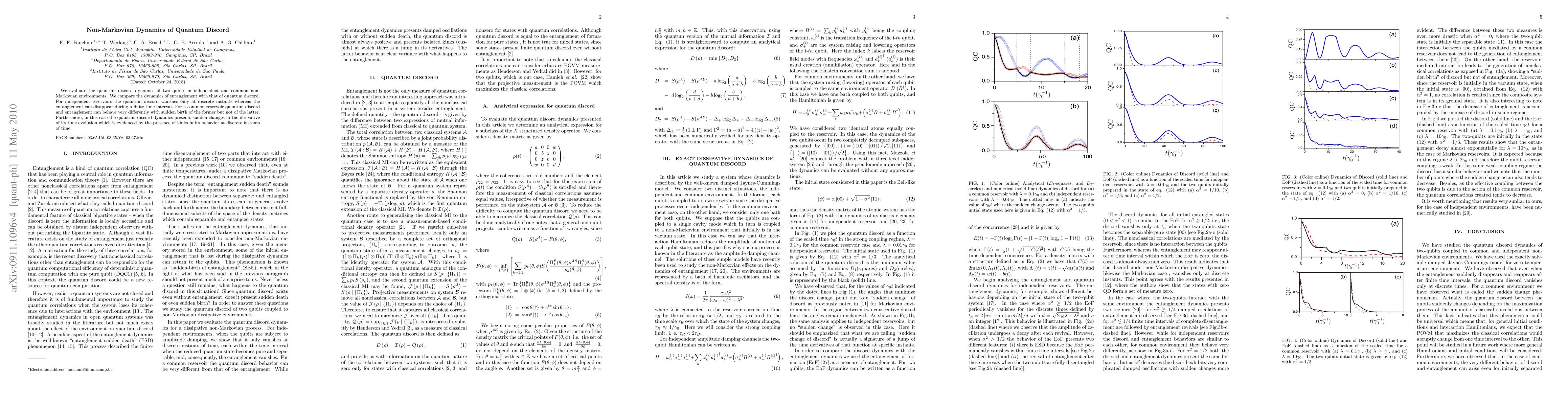 This paper investigates the non-Markovian dynamics of quantum discord in two qubits, comparing it to entanglement dynamics. It finds that quantum discord can vanish only at discrete times in independent environments, while entanglement may disappear over intervals, and can exhibit sudden changes in its derivative when influenced by a common environment.