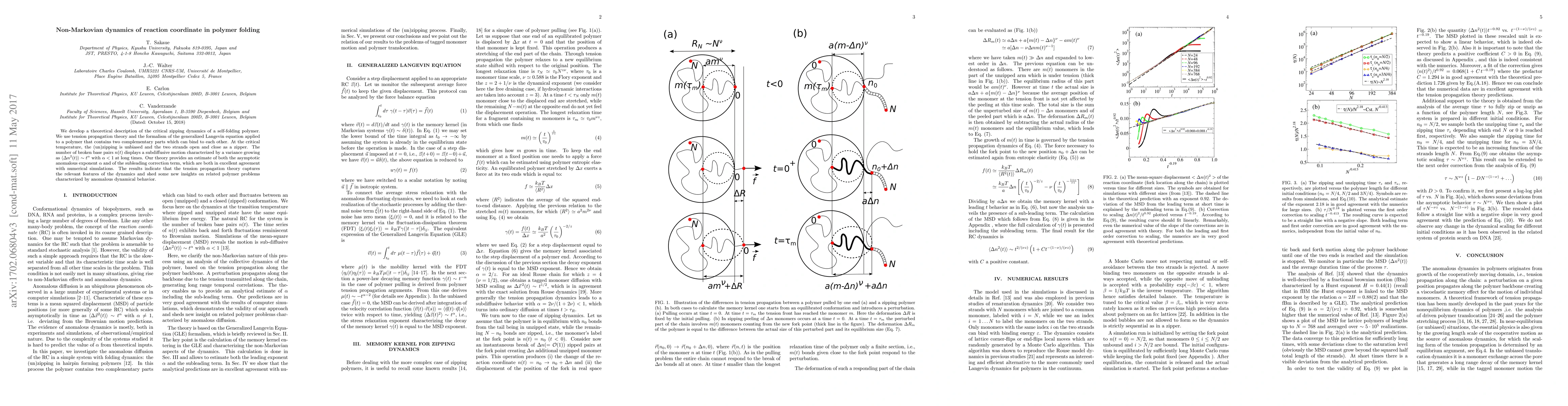We develop a theoretical description of the critical zipping dynamics of a self-folding polymer. We use tension propagation theory and the formalism of the generalized Langevin equation applied to a polymer that contains two complementary parts which can bind to each other. At the critical temperature, the (un)zipping is unbiased and the two strands open and close as a zipper. The number of closed base pairs $n(t)$ displays a subdiffusive motion characterized by a variance growing as $\langle \Delta n^2(t) \rangle \sim t^\alpha$ with $\alpha < 1$ at long times. Our theory provides an estimate of both the asymptotic anomalous exponent $\alpha$ and of the subleading correction term, which are both in excellent agreement with numerical simulations. The results indicate that the tension propagation theory captures the relevant features of the dynamics and shed some new insights on related polymer problems characterized by anomalous dynamical behavior.
