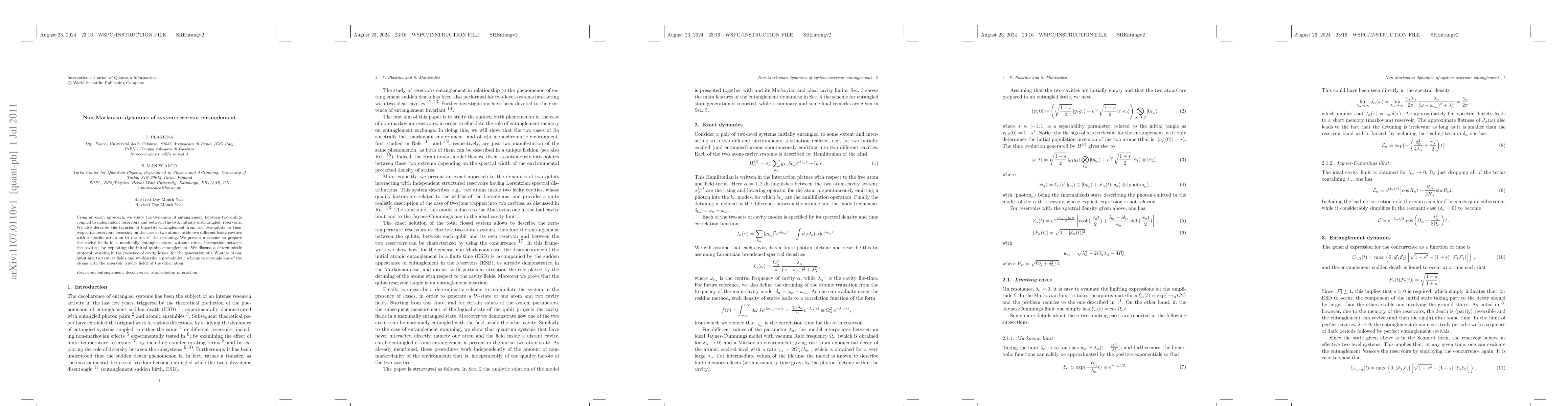 Using an exact approach, we study the dynamics of entanglement between two qubits coupled to independent reservoirs and between the two, initially disentangled, reservoirs. We also describe the transfer of bipartite entanglement from the two-qubits to their respective reservoirs focussing on the case of two atoms inside two different leaky cavities with a specific attention to the role of the detuning. We present a scheme to prepare the cavity fields in a maximally entangled state, without direct interaction between the cavities, by exploiting the initial qubits entanglement. We discuss a deterministic protocol, working in the presence of cavity losses, for the generation of a W-state of one qubit and two cavity fields and we describe a probabilistic scheme to entangle one of the atoms with the reservoir (cavity field) of the other atom.