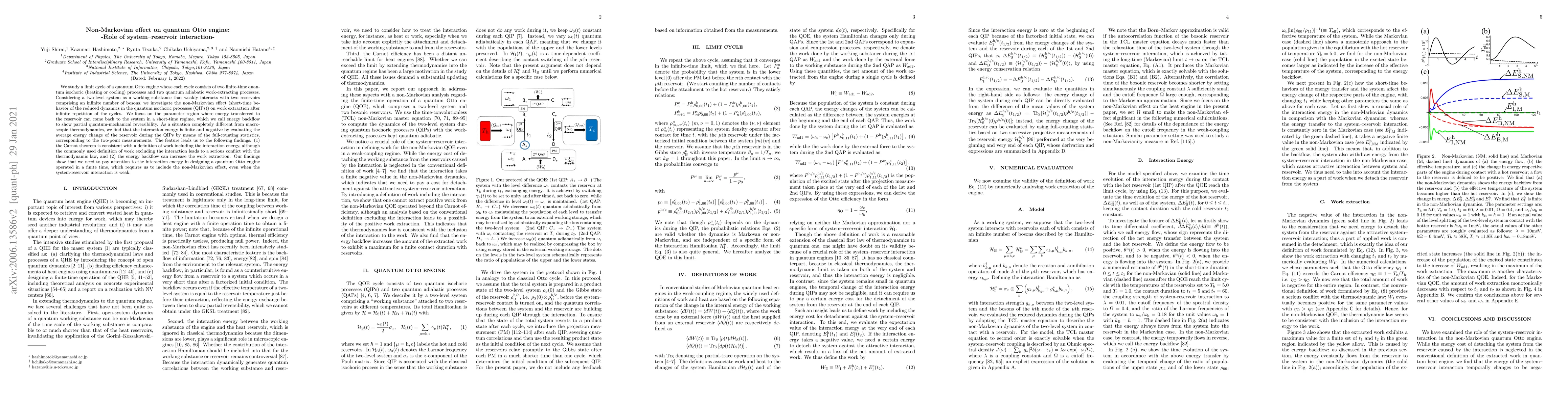 We study a limit cycle of a quantum Otto engine whose each cycle consists of two finite-time quantum isochoric (heating or cooling) processes and two quantum adiabatic work-extracting processes. Considering a two-level system as a working substance that weakly interacts with two reservoirs comprising an infinite number of bosons, we investigate the non-Markovian effect (short-time behavior of the reduced dynamics in the quantum isochoric processes (QIPs)) on work extraction after infinite repetition of the cycles. We focus on the parameter region where energy transferred to the reservoir can come back to the system in a short-time regime, which we call energy backflow to show partial quantum-mechanical reversibility. As a situation completely different from macroscopic thermodynamics, we find that the interaction energy is finite and negative by evaluating the average energy change of the reservoir during the QIPs by means of the full-counting statistics, corresponding to the two-point measurements. The feature leads us to the following findings: (1) the Carnot theorem is consistent with a definition of work including the interaction energy, although the commonly used definition of work excluding the interaction leads to a serious conflict with the thermodynamic law, and (2) the energy backflow can increase the work extraction. Our findings show that we need to pay attention to the interaction energy in designing a quantum Otto engine operated in a finite time, which requires us to include the non-Markovian effect, even when the system-reservoir interaction is weak.