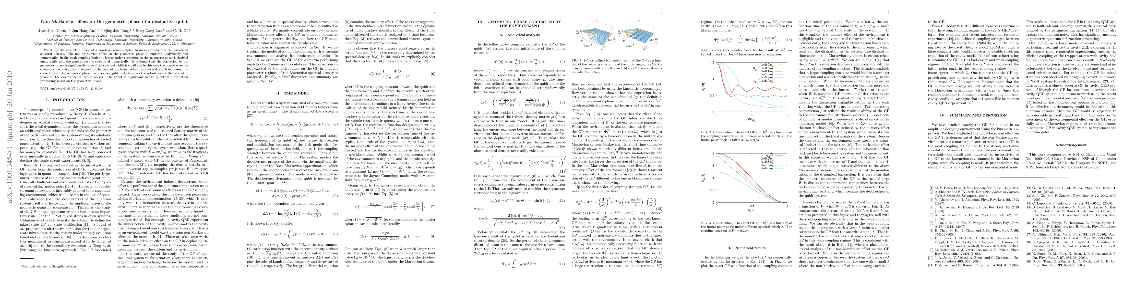 This paper investigates the geometric phase in a dissipative qubit system with Lorentzian spectral density, analyzing both non-Markovian effects analytically and numerically. It finds that small spectral widths significantly alter the geometric phase due to non-Markovian dynamics, while larger spectral widths render the geometric phase robust against environmental noise, which is crucial for quantum information processing.