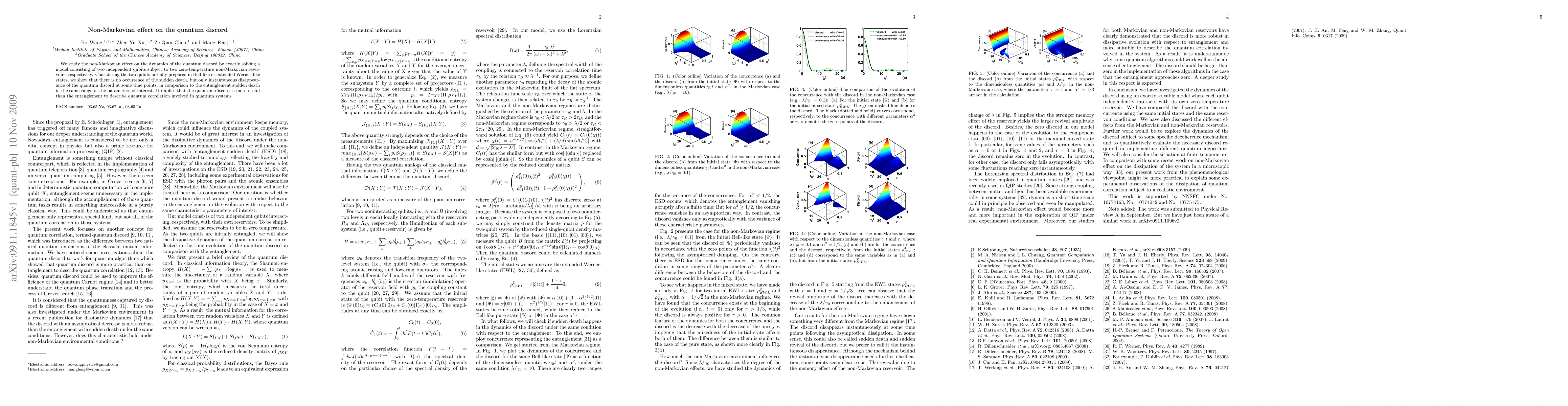The paper investigates the dynamics of quantum discord under non-Markovian conditions in two independent qubits interacting with zero-temperature reservoirs. It finds that quantum discord exhibits instantaneous disappearance rather than sudden death, contrasting with entanglement, suggesting discord's superior role in describing quantum correlations.