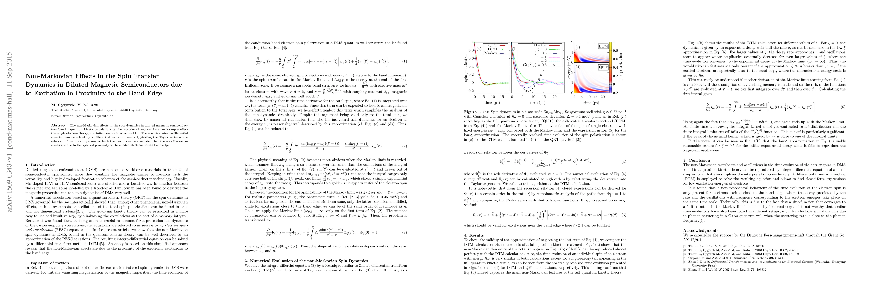 The non-Markovian effects in the spin dynamics in diluted magnetic semiconductors found in quantum kinetic calculations can be reproduced very well by a much simpler effective single electron theory, if a finite memory is accounted for. The resulting integro-differential equation can be solved by a differential transform method, yielding the Taylor series of the solution. From the comparison of both theories it can be concluded that the non-Markovian effects are due to the spectral proximity of the excited electrons to the band edge.