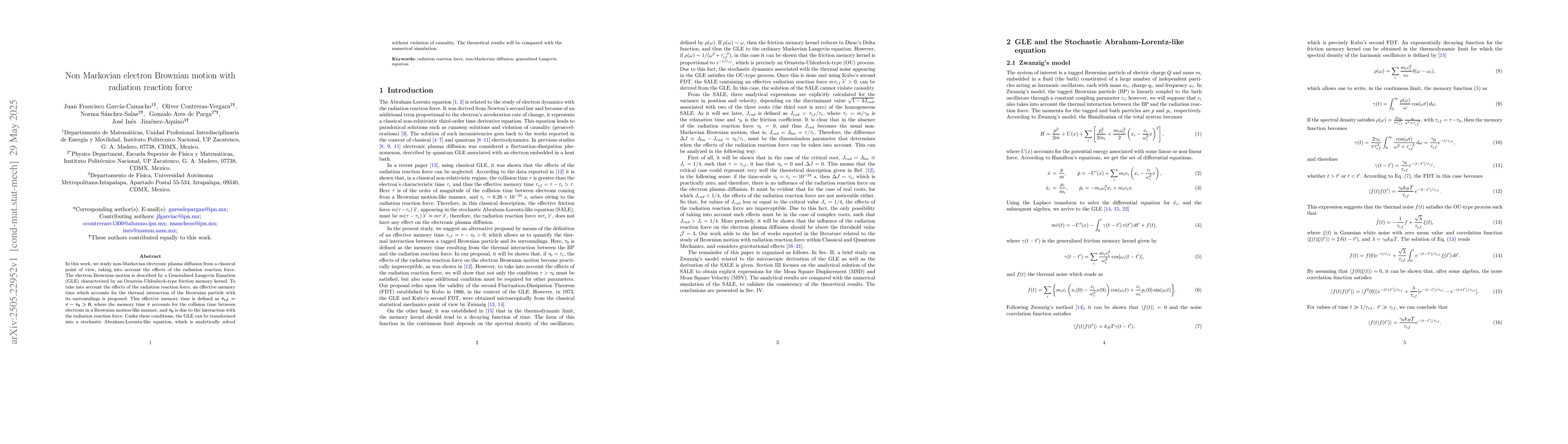 The paper introduces an effective memory time to incorporate the radiation reaction force in the Generalized Langevin Equation, enabling an analytical solution for the Stochastic Abraham-Lorentz-like equation describing non-Markovian electron Brownian motion.