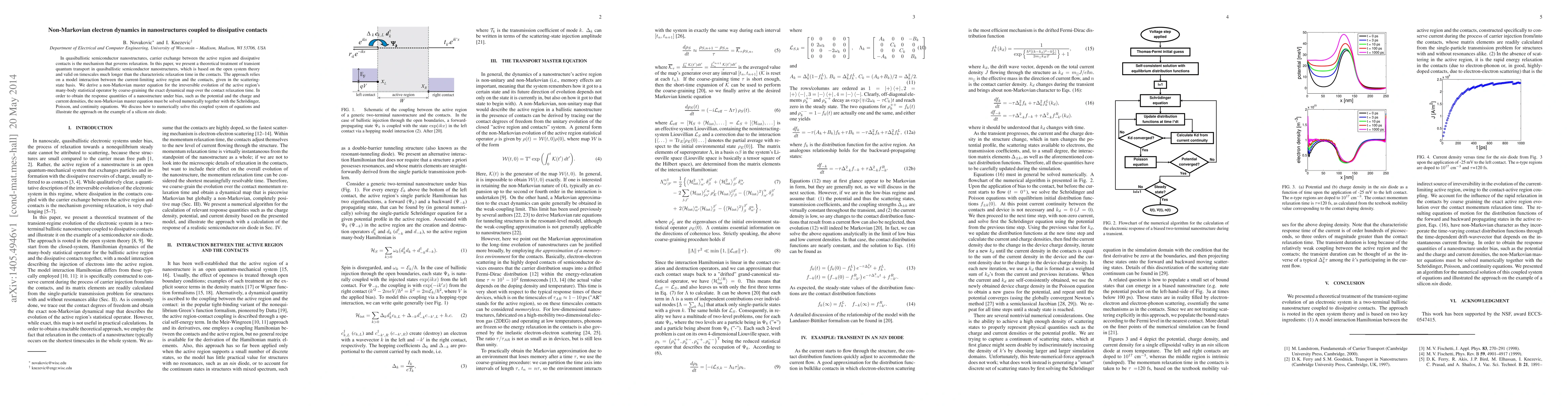 In quasiballistic semiconductor nanostructures, carrier exchange between the active region and dissipative contacts is the mechanism that governs relaxation. In this paper, we present a theoretical treatment of transient quantum transport in quasiballistic semiconductor nanostructures, which is based on the open system theory and valid on timescales much longer than the characteristic relaxation time in the contacts. The approach relies on a model interaction between the current-limiting active region and the contacts, given in the scattering-state basis. We derive a non-Markovian master equation for the irreversible evolution of the active region's many-body statistical operator by coarse-graining the exact dynamical map over the contact relaxation time. In order to obtain the response quantities of a nanostructure under bias, such as the potential and the charge and current densities, the non-Markovian master equation must be solved numerically together with the Schr\"{o}dinger, Poisson, and continuity equations. We discuss how to numerically solve this coupled system of equations and illustrate the approach on the example of a silicon nin diode.