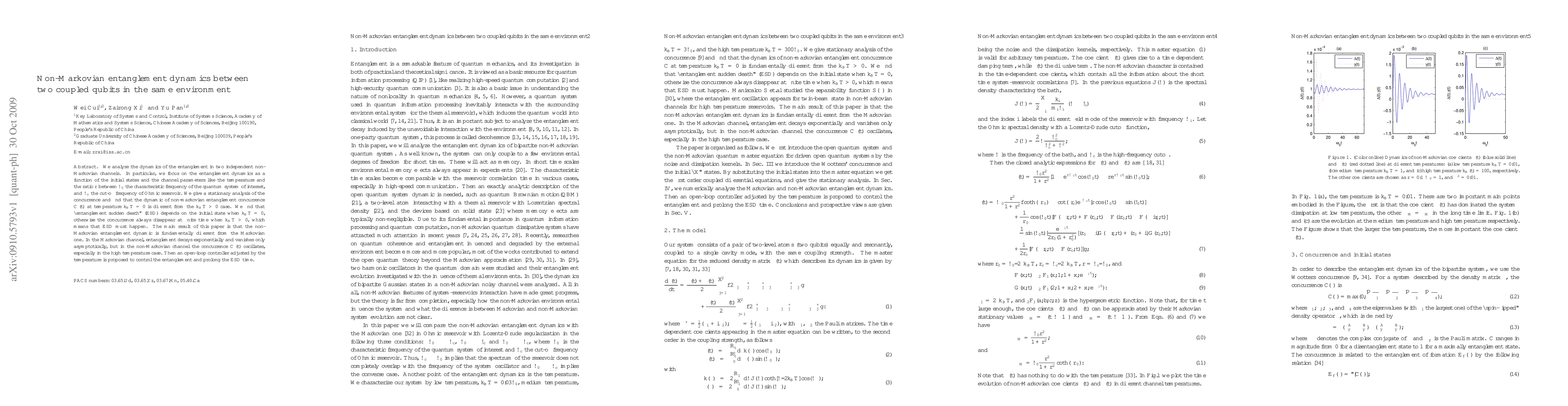 This paper investigates the non-Markovian entanglement dynamics between two coupled qubits in a shared environment, showing that non-Markovian effects lead to oscillatory concurrence dynamics, unlike the exponential decay seen in Markovian channels. It proposes an open-loop controller to manage entanglement and prolong "entanglement sudden death" time.