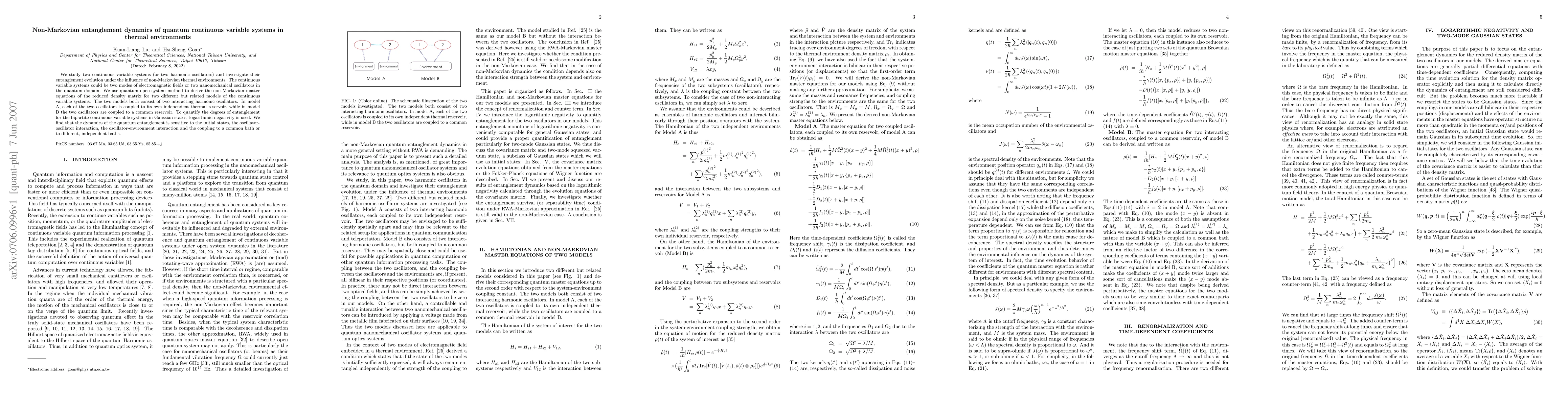 This paper explores the entanglement dynamics of two continuous variable quantum systems in thermal environments, deriving non-Markovian master equations for two models. It finds that entanglement evolution is influenced by initial states, oscillator interactions, and whether the systems share a common thermal reservoir or have independent baths.
